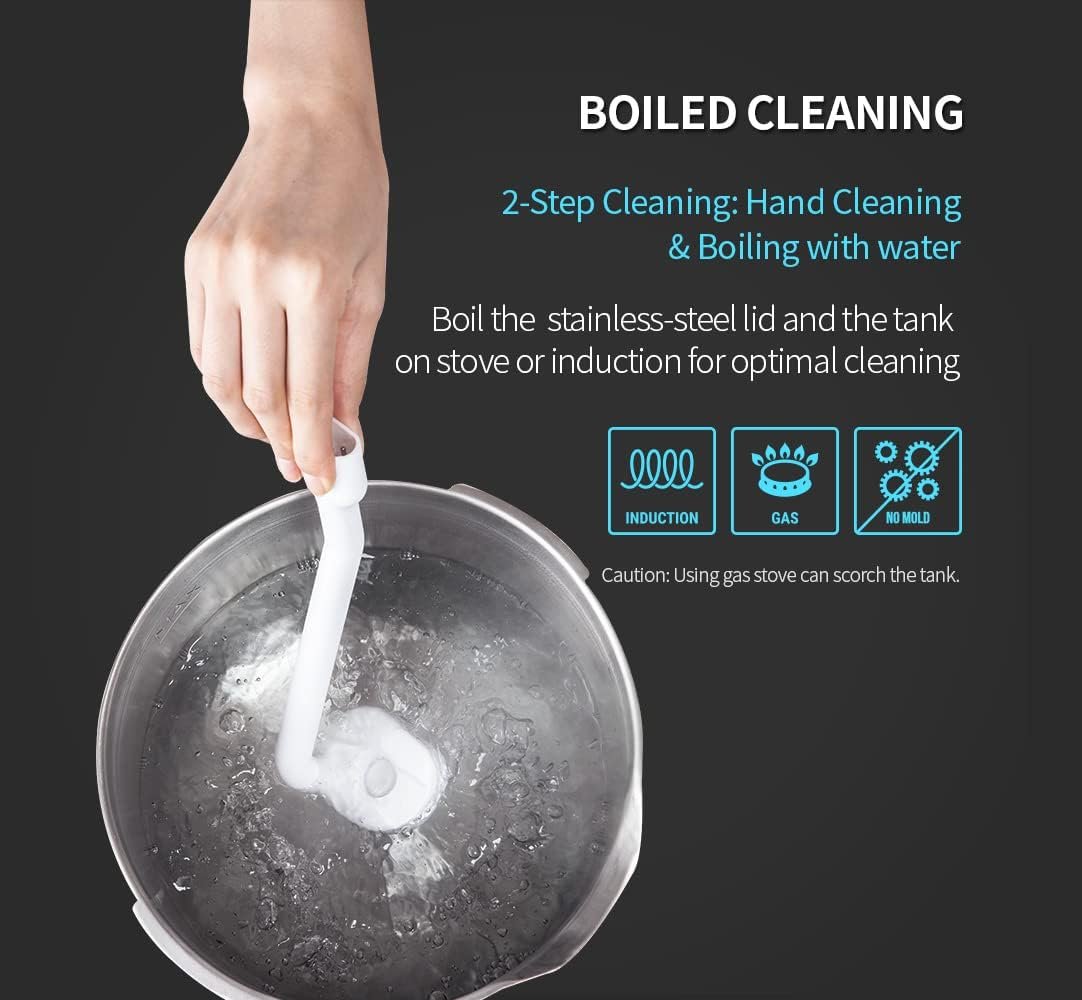 Manufactured in Korea, the food-grade 304 stainless-steel water tank, together with the lid, can be boiled to keep sterilized.