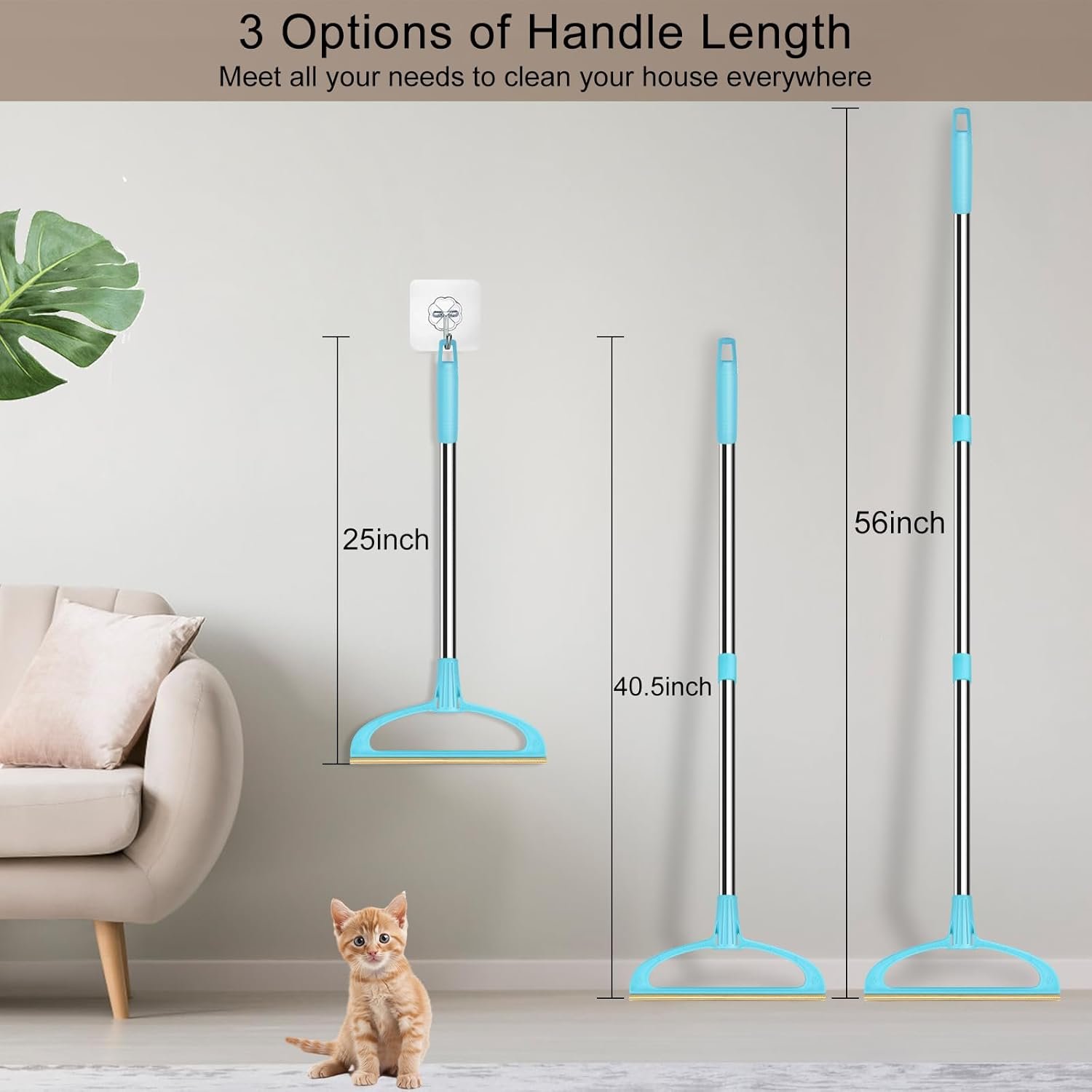 The handle of the aizal dog hair remover, composed of a session of 3 pieces of high-quality steel sections, is adjustable in length ranging from 25 to 56 inches. Also the pet hair remover for carpet is easy to maintain, no need extra brush to clean but just your hands.