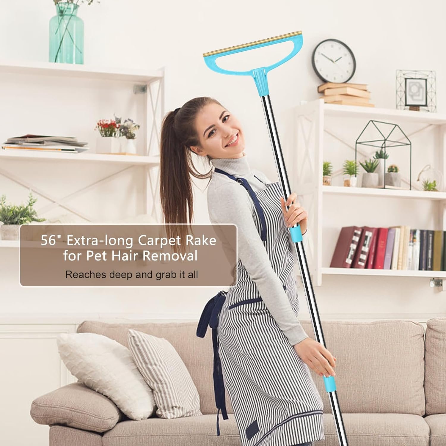 NO MORE KNEELING, STAND TO RAKE: Tired of kneeling on the carpet to remove cat/dog hair for long time with short handle tool? Use our AIZAL 56”long handle carpet rake , standing to clean & spending less time crawling on your hands and knees. A few swipes and you can remove a shocking amount of stubborn dog hair just in several minutes.