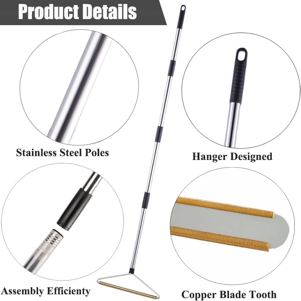 【Durable & Washable】Upgraded carpet scraper with stainless steel rods and copper blade tooth that assures durability. Super easy clean up simply with wet cloth. It is convenient that the pet hair carpet rake head can be detached when rinsed.