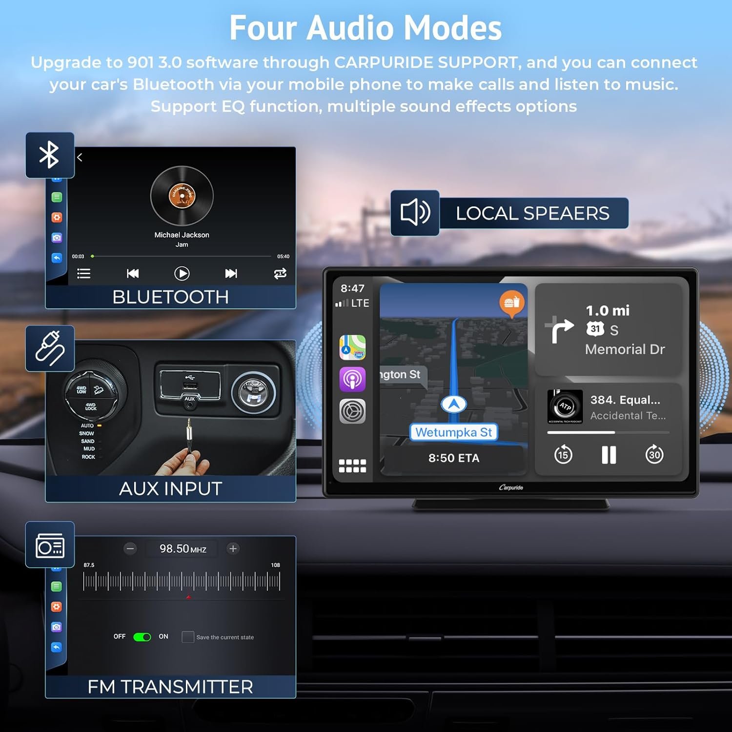 🚗【Four Audio Output Options】Connect your phone via Bluetooth for calls and Bluetooth music(Please UPGRADE the SOFTWARE through CARPURIDE SUPPORT); Use the built-in speaker and mic of the W901 for music and calls ; Connect to car speakers via AUX cable or FM transmission for audio playback and calls.