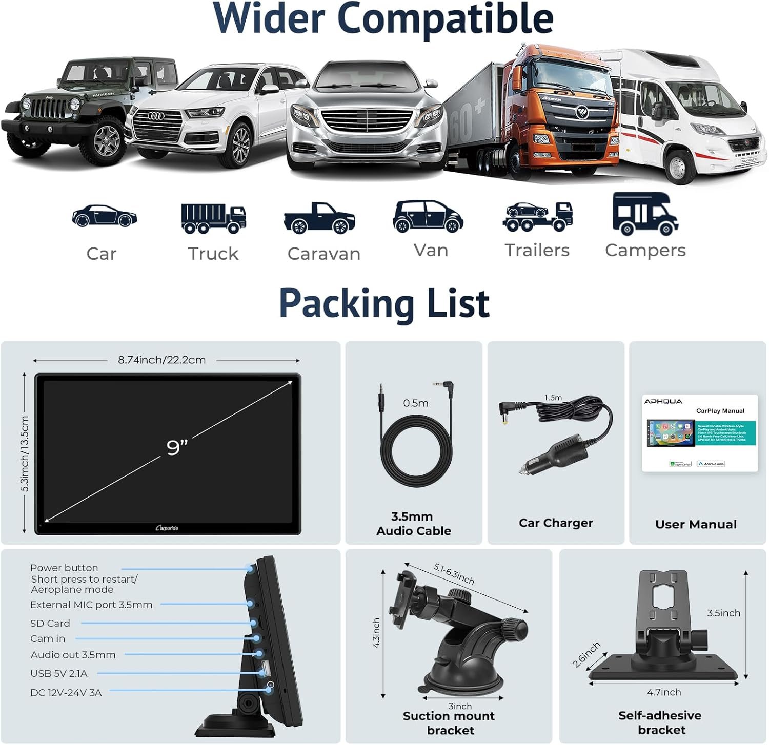 🚗【Compatible with all models】Carpuride 9 inch car audio powered by cigarette lighter,12-24V voltage, suitable for almost all kinds of years of the cars and trucks. Note: Volkswagen needs to install an extra relay to install the rearview camera, camera is not included in the package.base supports 360 degree rotation, plug and play, so you can save a lot of installation costs.