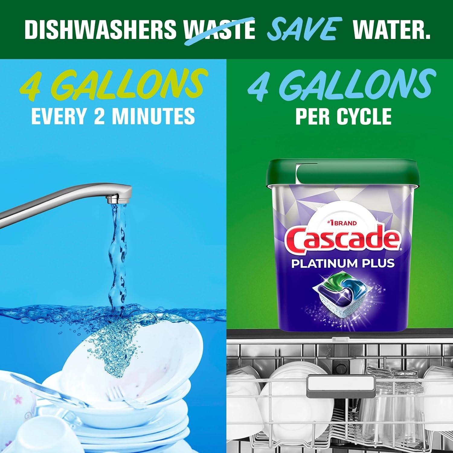 Cascade Platinum Plus ActionPacs dishwasher detergent gives your dishes a breakthrough, cabinet ready clean. Loaded with 2X* the Dawn grease fighting power, and 2X* the food scrubbing power, it has soaking, scrubbing, and rinsing built right in. You can skip the pre-rinse, skip the soak, skip the scrub, and dare to dish differently. Just scrape your dishes and load them into your dishwasher with Platinum Plus to get a superior, sparkling clean, saving you time, effort, and energy vs handwashing. Get virtually spotfree gleaming glassware, dazzling dishes, and pristine pots and pans with Cascade Platinum Plus dishwashing ActionPacs. *Cleaning ingredients vs. Cascade Complete ActionPacs.