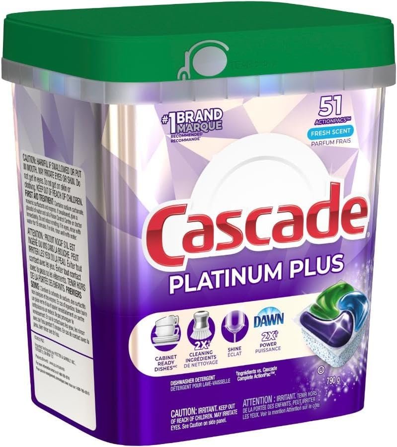Cascade Platinum Plus ActionPacs dishwasher detergent gives your dishes a breakthrough, cabinet ready clean. Loaded with 2X* the Dawn grease fighting power, and 2X* the food scrubbing power, it has soaking, scrubbing, and rinsing built right in. You can skip the pre-rinse, skip the soak, skip the scrub, and dare to dish differently. Just scrape your dishes and load them into your dishwasher with Platinum Plus to get a superior, sparkling clean, saving you time, effort, and energy vs handwashing. Get virtually spot free gleaming glassware, dazzling dishes, and pristine pots and pans with Cascade Platinum Plus dishwashing ActionPacs. *Cleaning ingredients vs. Cascade Complete ActionPacs.