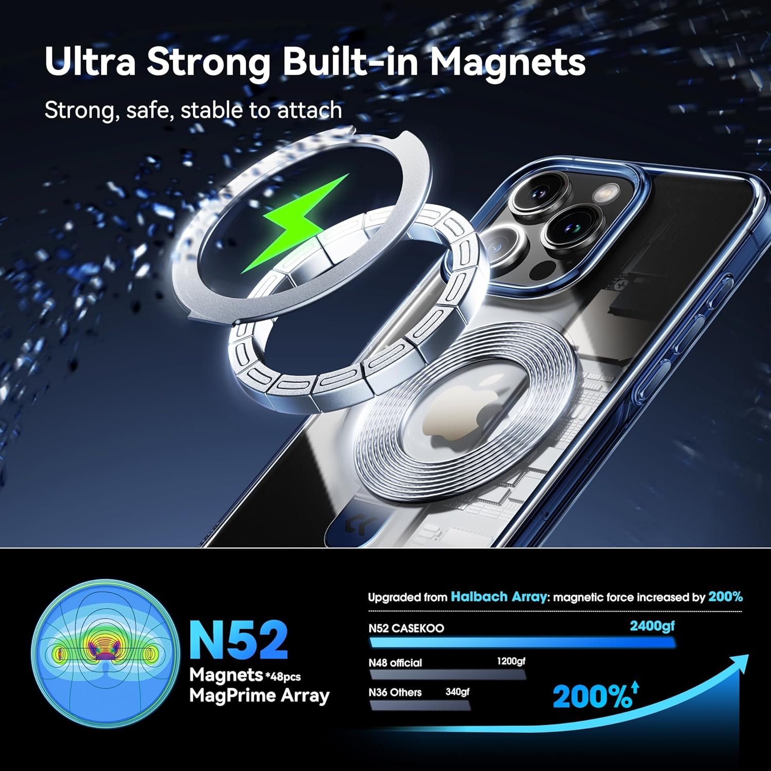 [Super Magnetic Properties] The magnetic ring on the back of the CASEKOO mobile phone case uses 48 N52 magnets in a Halbach array to achieve a suction force of 2400 grams. 200% stronger suction than bare metal or official cases. Ensures a secure connection with all accessories. The precisely aligned design achieves a 1:1 maximum output for fast and safe charging.