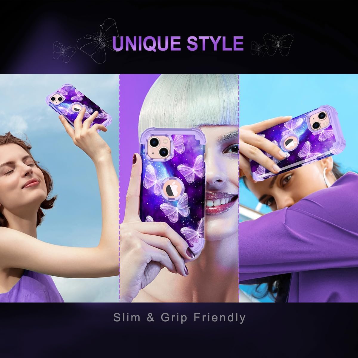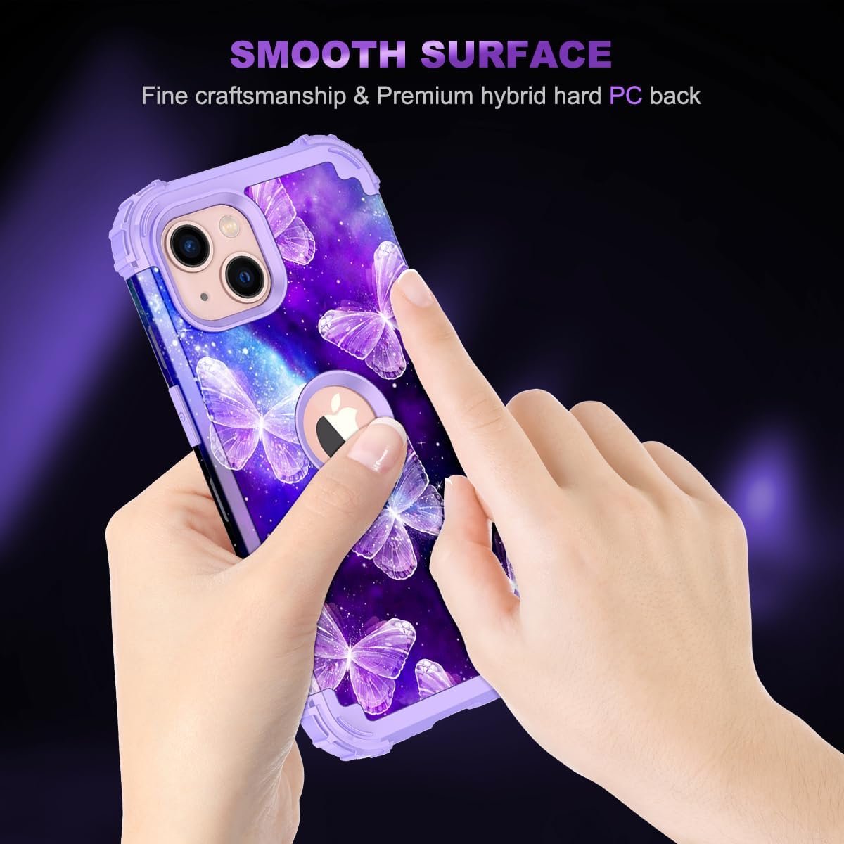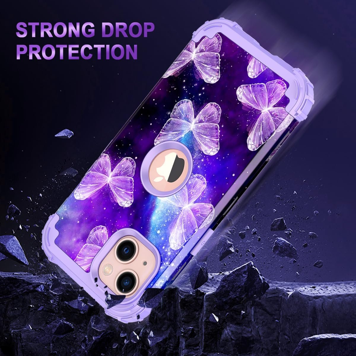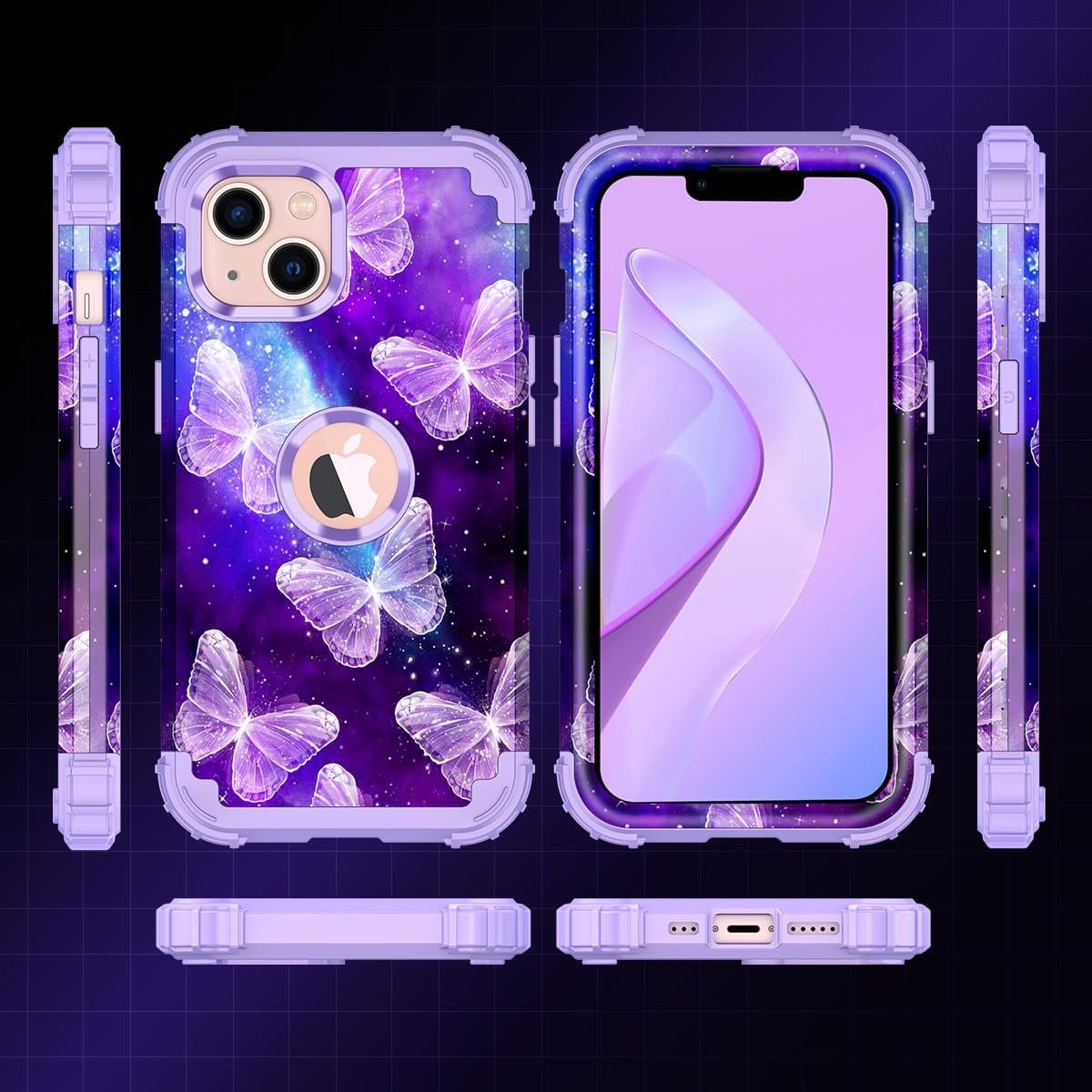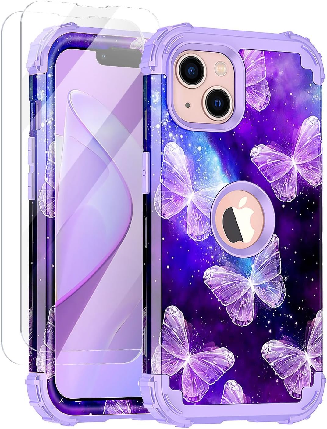 Casetego for iPhone 13 Case,[2 Pack Tempered Screen Protector] Shockproof Three Layer Heavy Duty Hard Plastic Bumper+Soft Silicone Rubber Full Protective Case for iPhone 13 6.1 inch,Butterfly