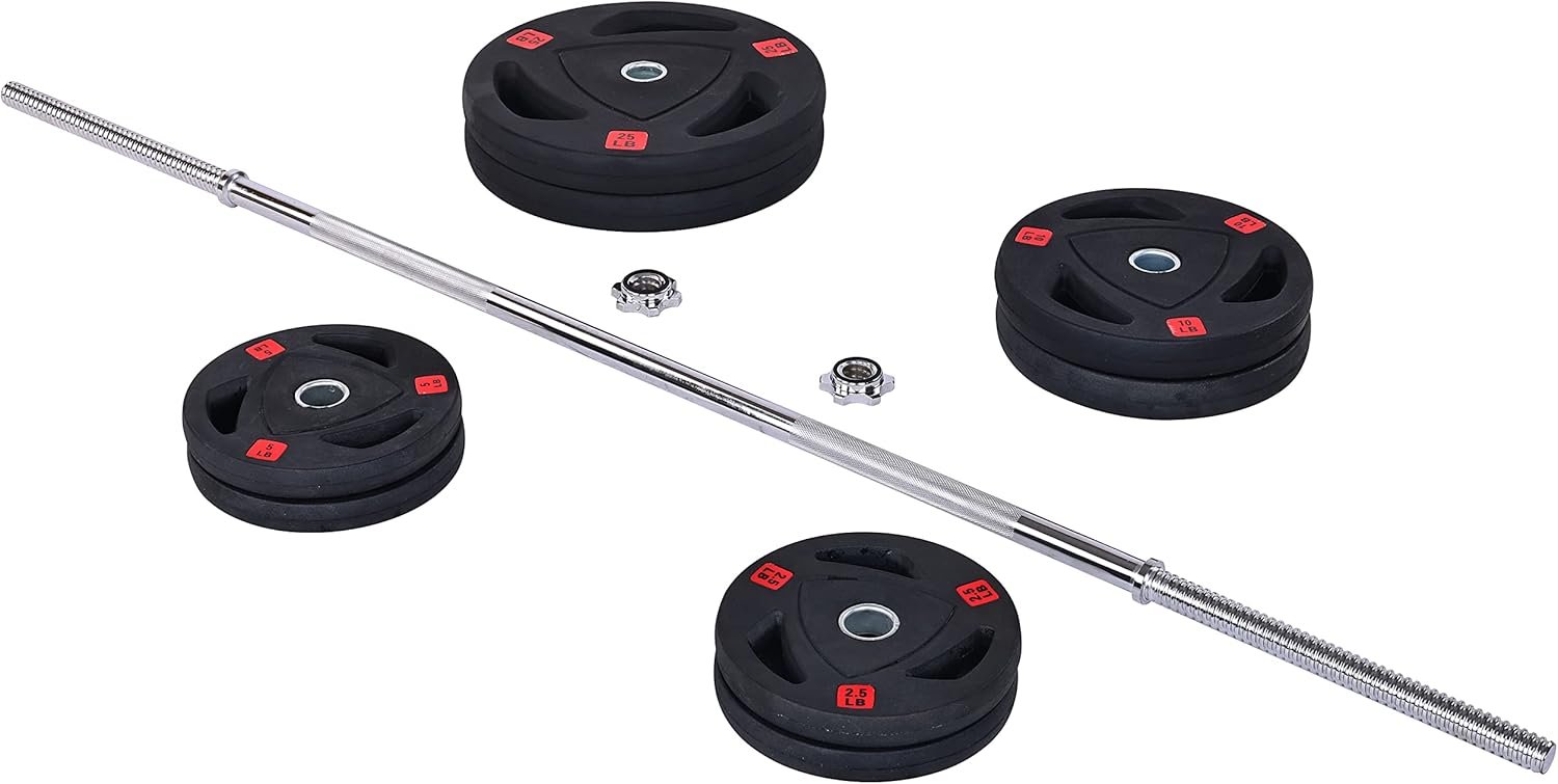 95 pounds set: 1x 5 feet Standard Barbell with Star Locks (10 lbs), 2x 2.5lb, 2x 5lb, 2x 10lb, 2x 25lb cast iron plates