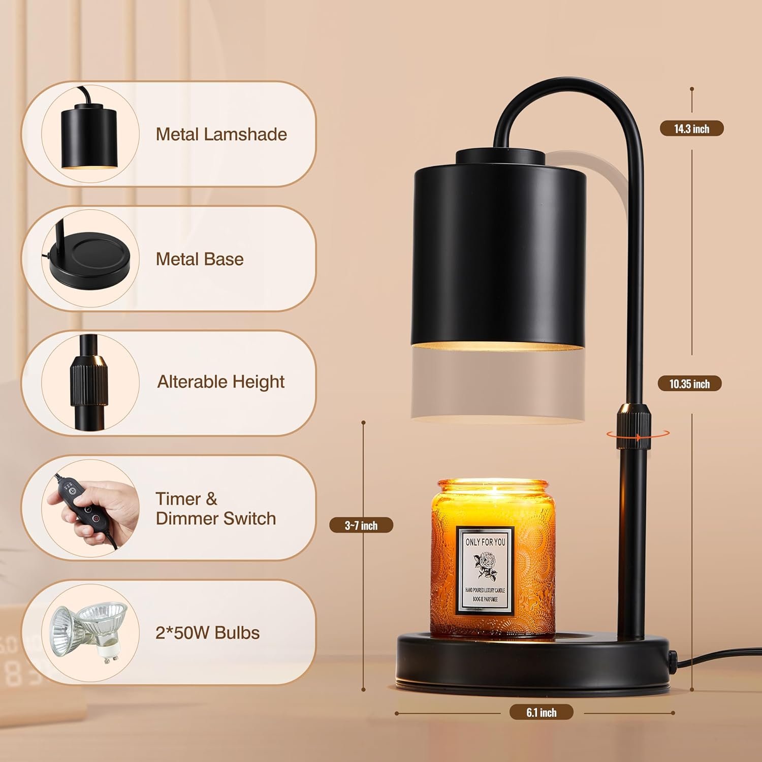 Adjustable Height Suits for Various Sizes of Candles: CASTLELIFE Candle holder lamp is made of metal with Modern style design. The height-adjustable lamp pole design allows you to adjust the 10.43-14.37 inch height adjustment of the lamp head to fit most different types of jar candles or wax. Candle lamp warmer is designed with grooves on the base for storing candles of all sizes.