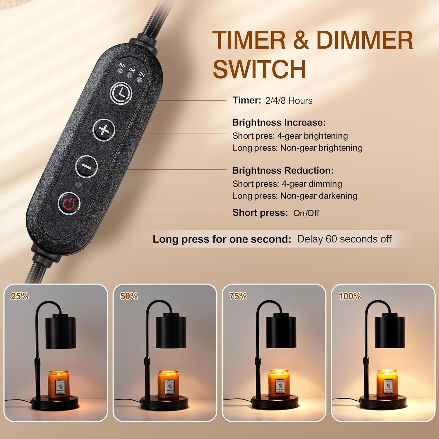 Timer and Dimming: Candle Warmer Lamp with timer and dimming functions to meet your personalized needs. You can choose from 2 H/4 H/8 H timer settings to accompany you safely to sleep in a quiet night. There are four different dimming options for you to arbitrarily control the melting speed of the candle and the length of the control time. Adjusting the light’s brightness for various occasions and moods