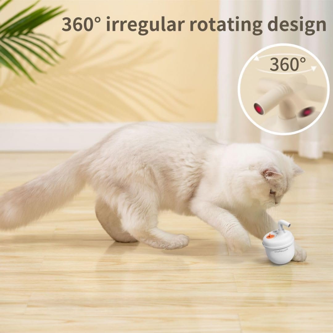 The cat toy rotates irregularly through 360° while stationary on the ground, making it impossible for cats to predict the direction of rotation and always keep their curiosity