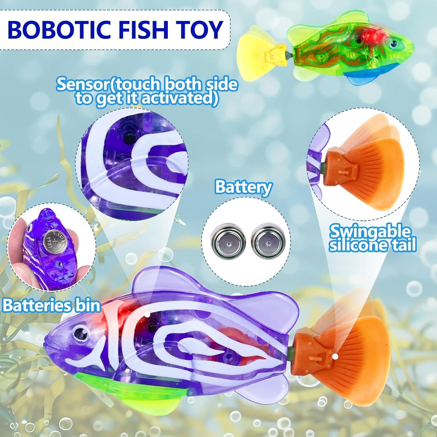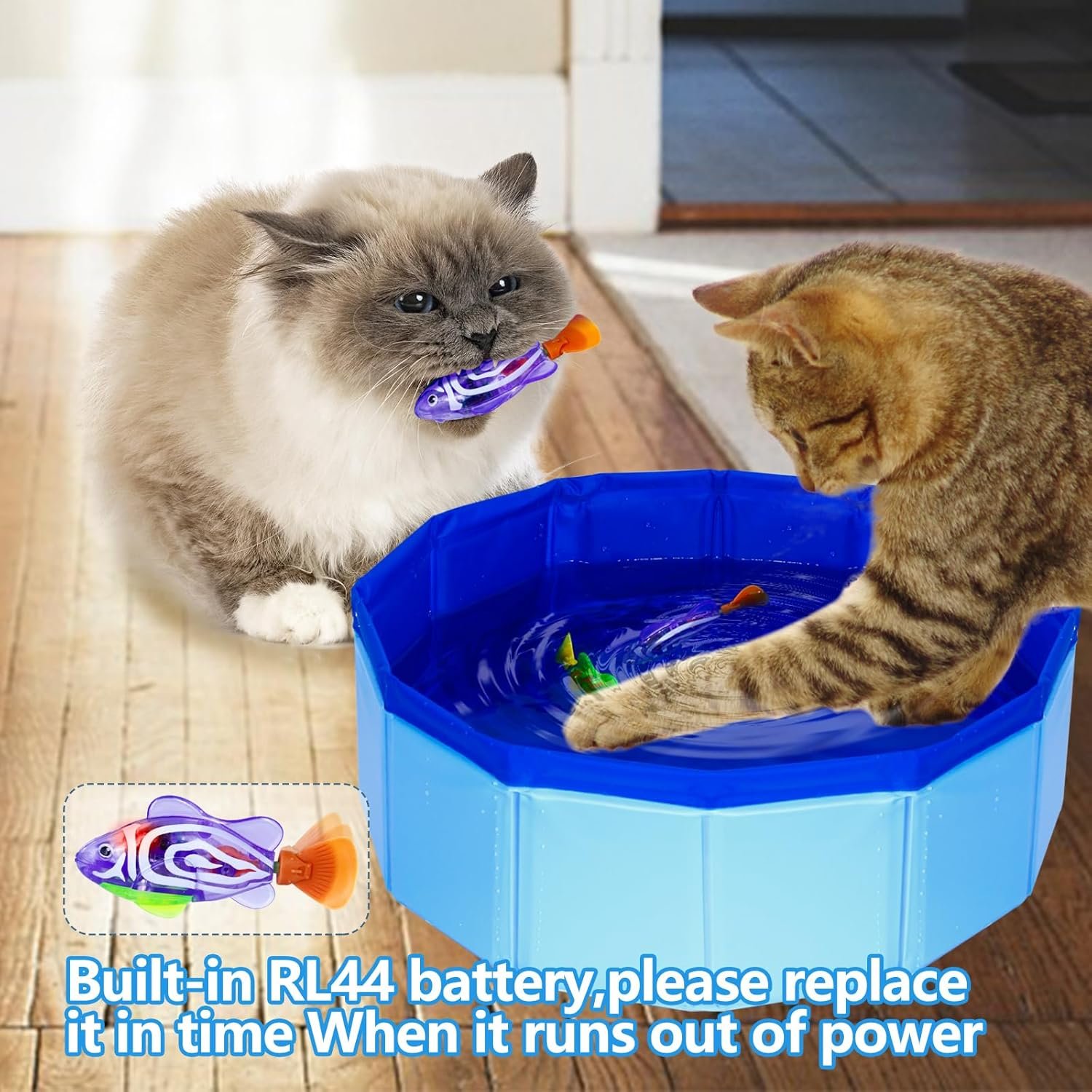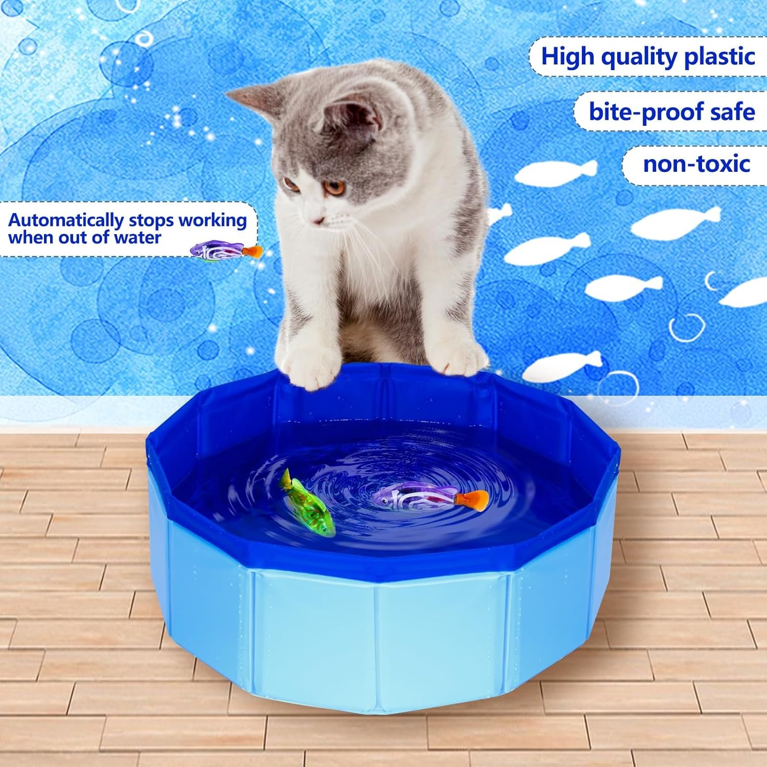High Quality And Safety Cat Toy Pool: The cat water play pool is made of sturdy and anti-scratch material. You don’t have to worry about your cat scratching the cat water play pool while catching fish, causing water leakage and other problems. Robot fish toys are made of Automatic swimming robot fish, which is very safe and friendly to your cat.
