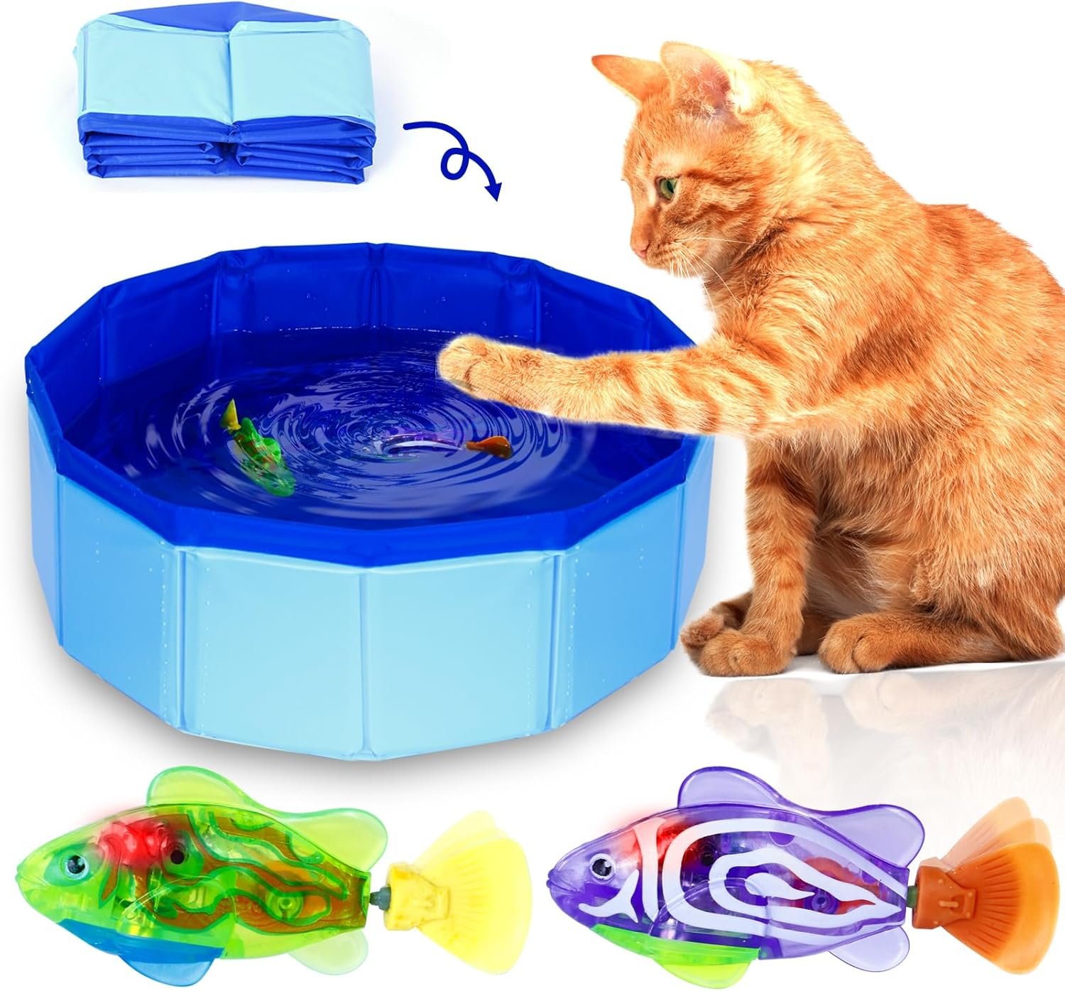 Cat Water Toy Play For Indoor Cats: cat toy pool with electric robotic fish is an irresistible lure for cats! Robotic fish toys “lure” will get your cats excited and trigger their natural “hunt instinct”, cats will catch robotic fish toys in cat water toy, reducing likelihood of a bored kitty with restless, annoying behaviors. You will have fun playing with your kitty, too.