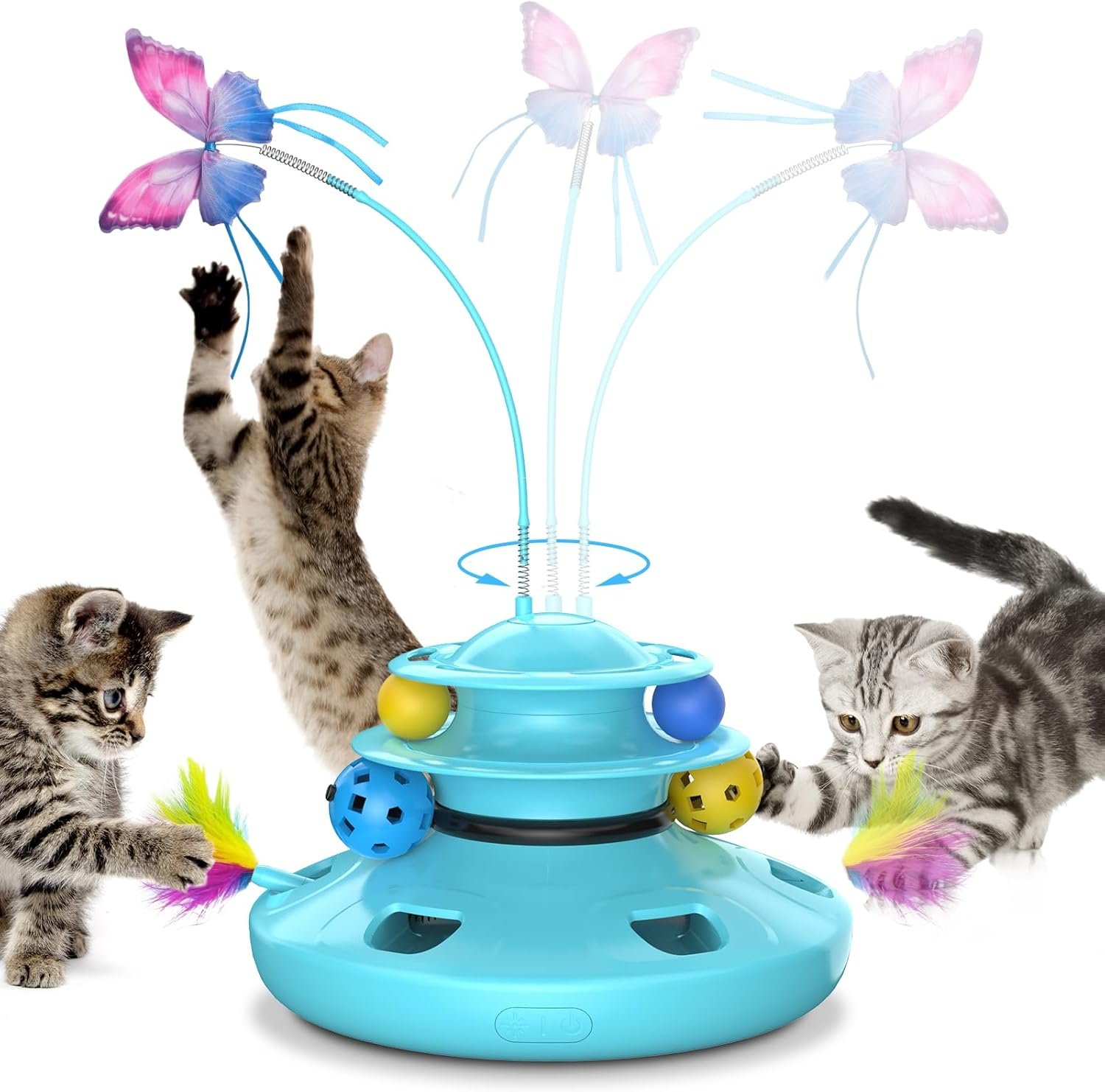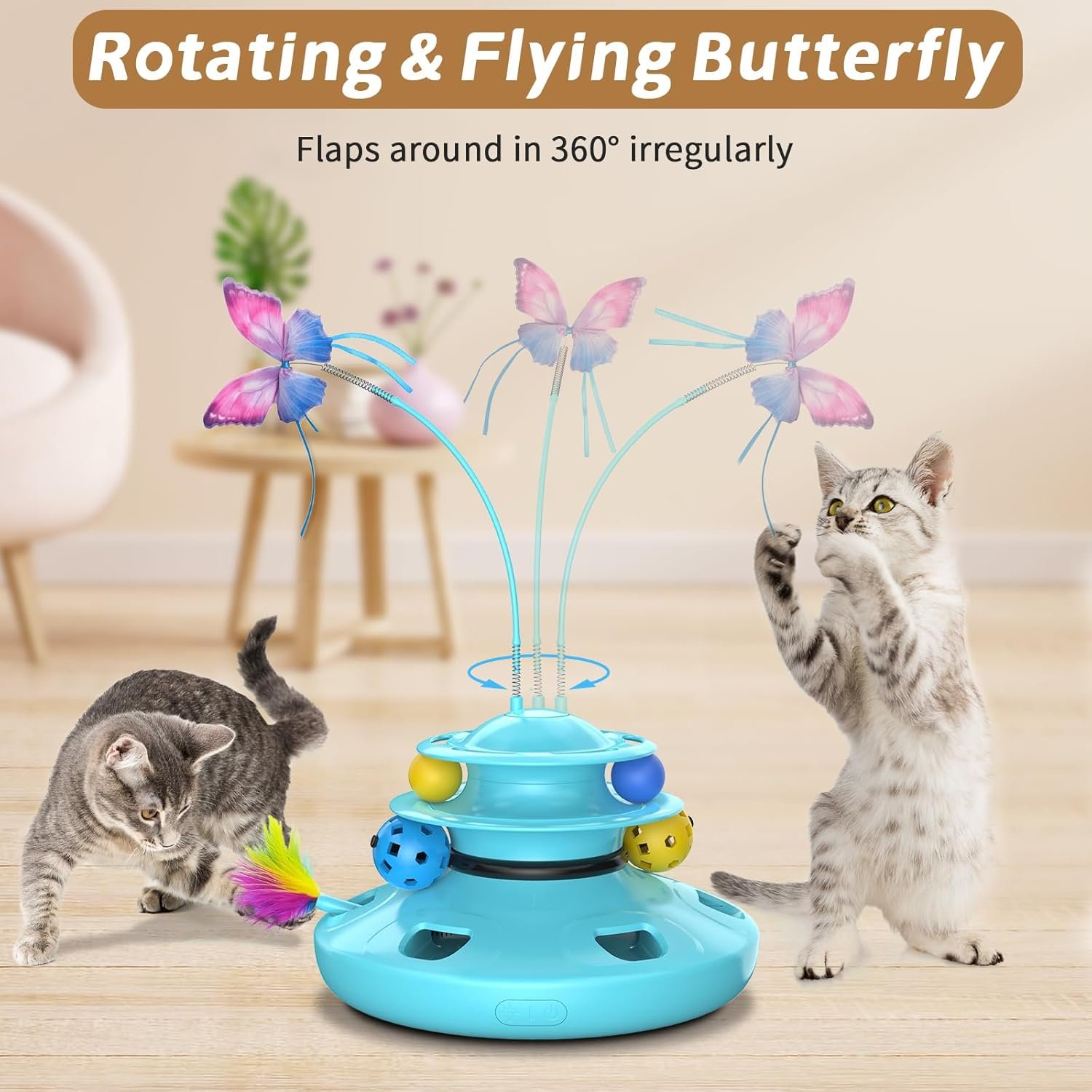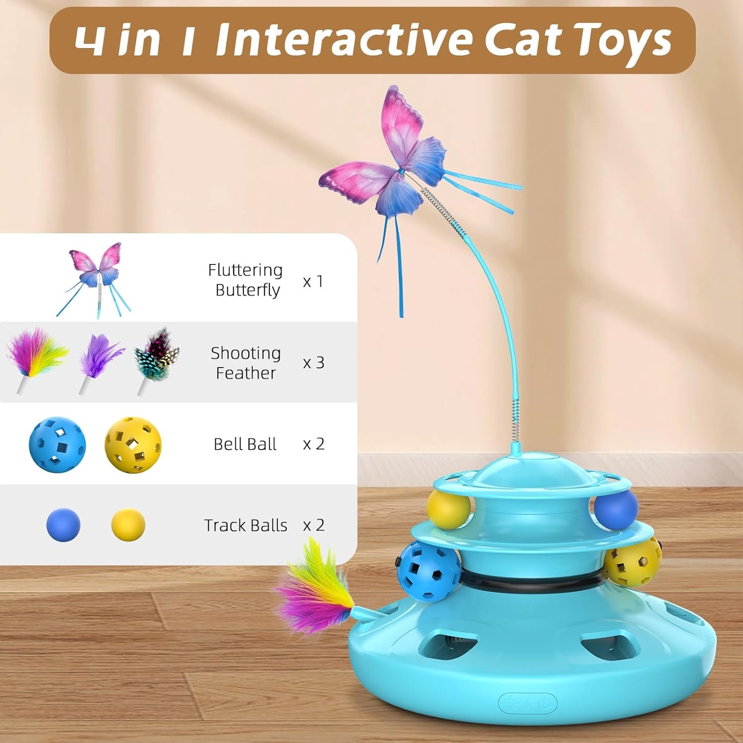 Cat Toys, 4-in-1 cat interactive toy for indoor Rechargeable Automatic with Fluttering Butterfly Random Moving Ambush Feather 2-Tier Track Balls for Bored Indoor Adult Cats Kittens All Breeds