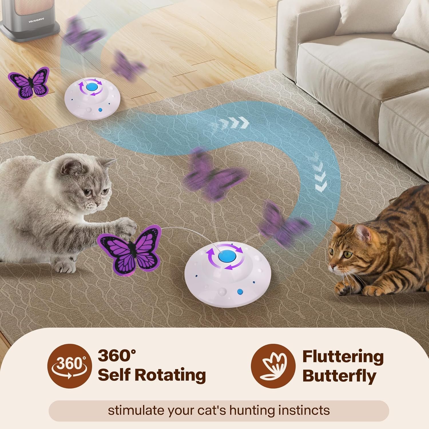 3-in-1 Interactive Cat Toys: 360°rotating butterflies,led lights,the toy also attracts cats by running in irregular movements on smooth floors.Different ways of playing let your cat get a variety of experiences, even at home, they won’t feel lonely