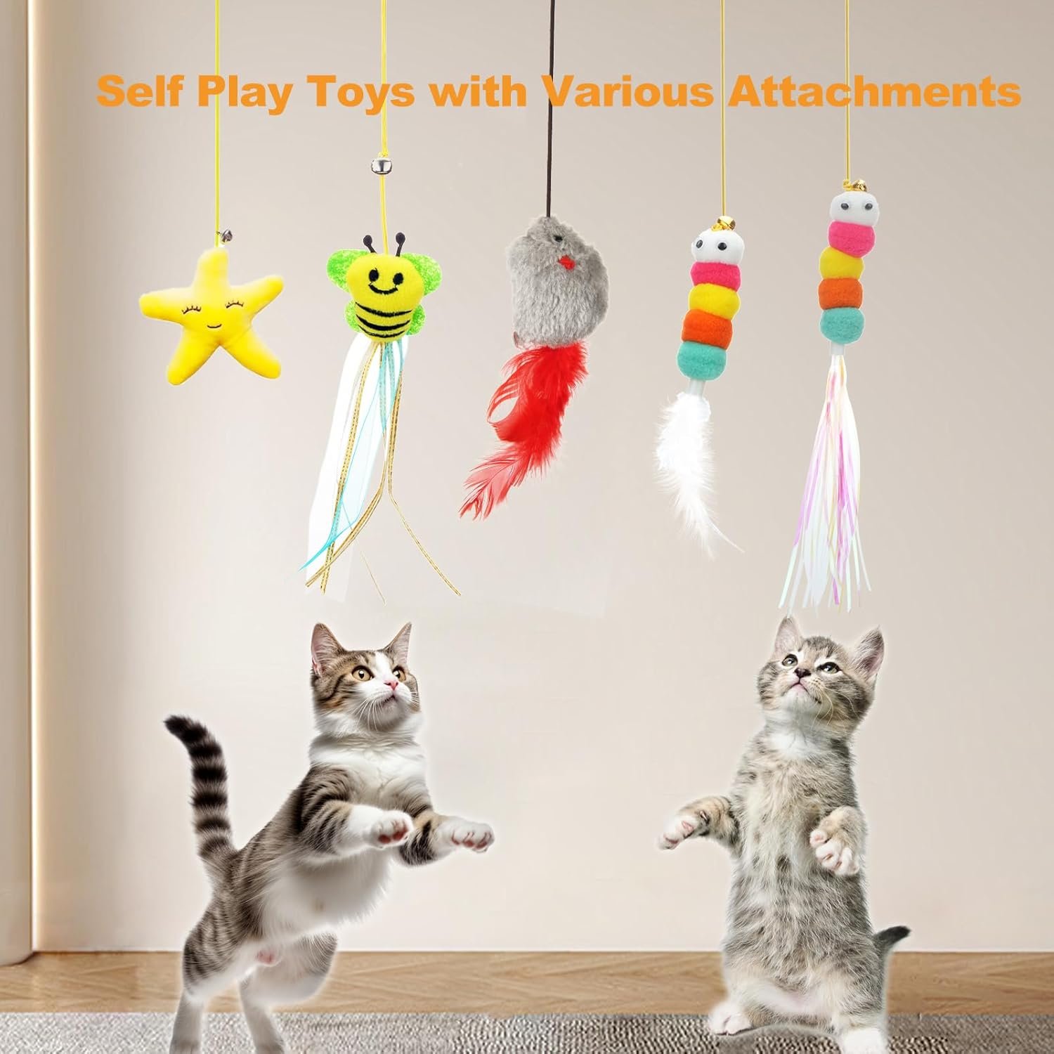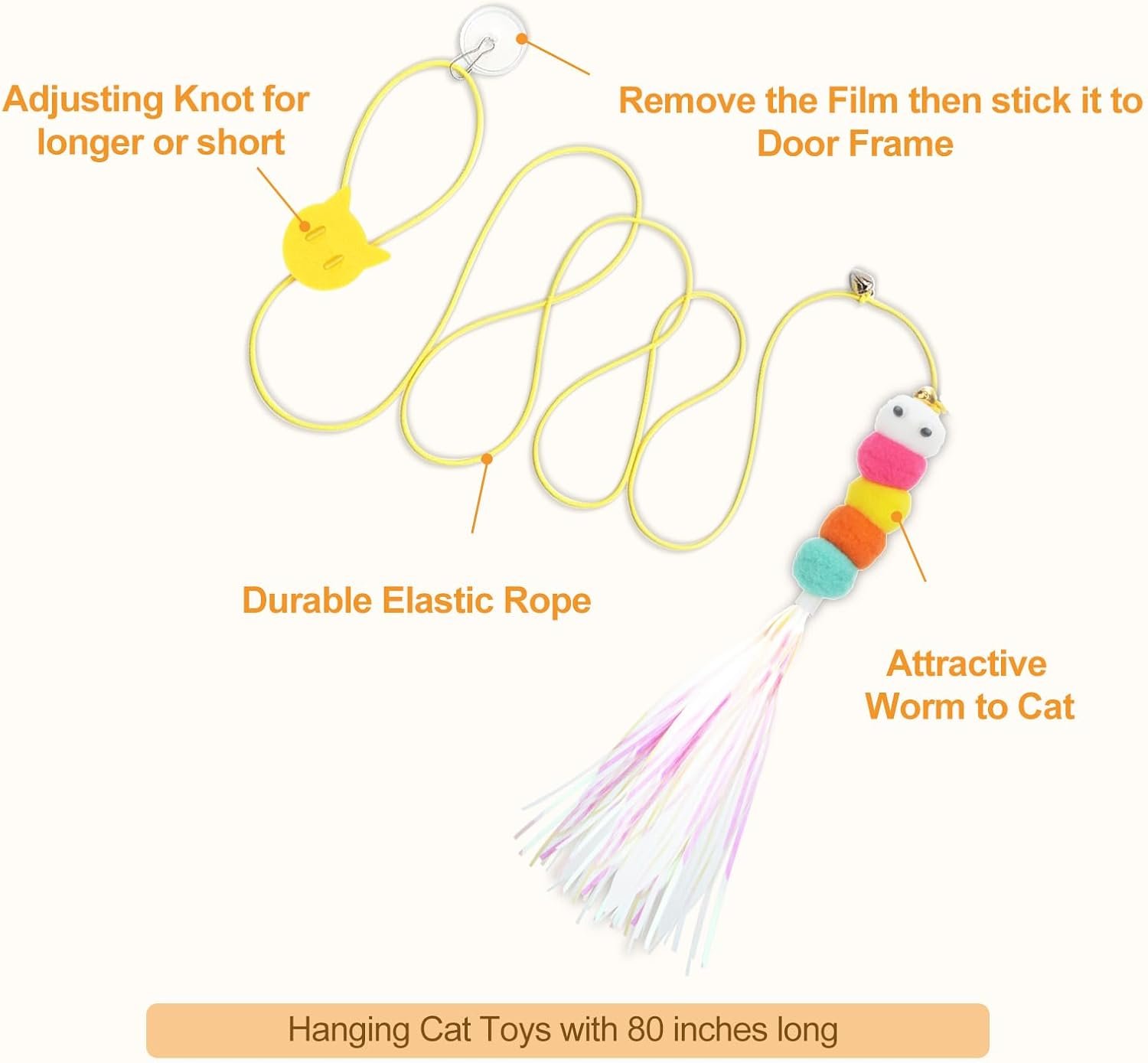 Door Hanging Pet Toy: 6piece door hanging pet toys includes mouse, bees, caterpillar, butterfly and star attachment, make cat and kitten excited for making jump and punch and chase exercise. Residue free glue used on the pad. Nothing would leave when remove it from door frame or table or window glass. Elastic rope can be adjusted longer or shorter to match different size requirements.