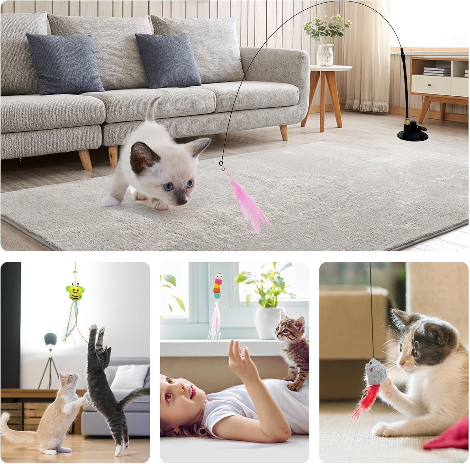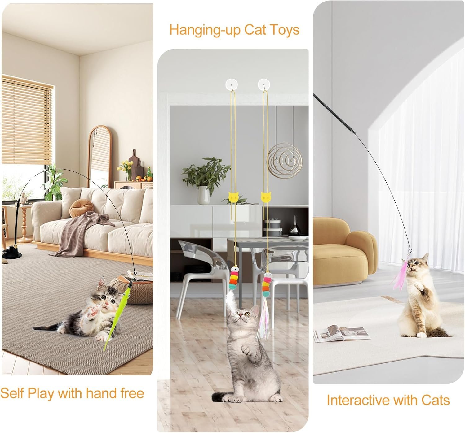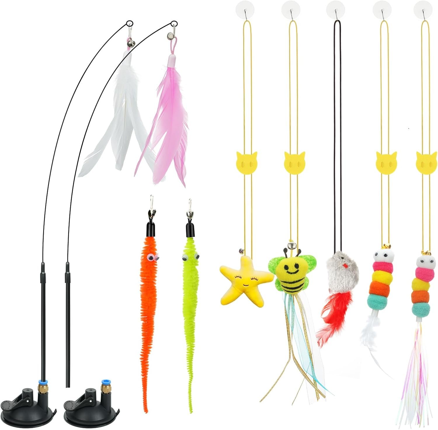 Hand Free Cat Toy Set: Atosun Interactive cat toys set include 2 pcs suction cup, 2 pcs cat wand toy with 4 pcs feather and worm toy replace. 6pcs door hanging cat toy. Full pet toys make you hand free or you can use the wand toy to interact with cats indoor.