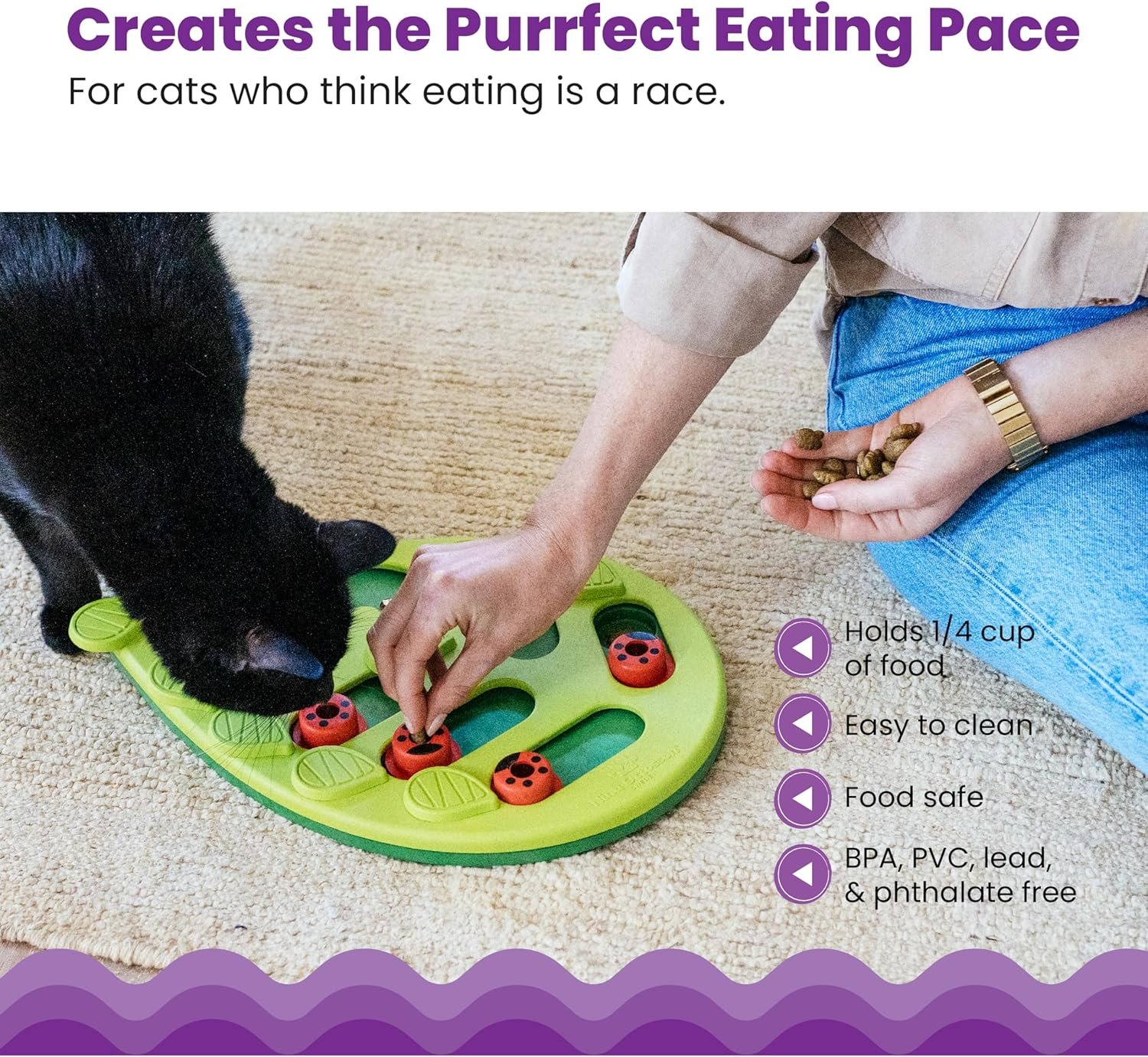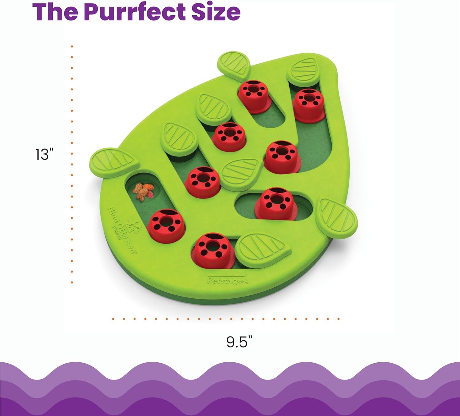 Your smarty cats will love the challenge of the Buggin’ Out Puzzle & Play by Nina Ottosson. Cats can bat at the pegs and swivel the leaves to uncover the 16 hidden treat compartments filled with goodies. Adjust the difficulty of the puzzle to make it easier for beginners or more challenging for super-smarty cats. Pet parents can feed meals to their cat from the puzzle to engage their hunting and foraging instincts; the puzzle holds up to 1/4th cup of food. This cat puzzle has zero removable parts to avoid any choking hazards and make cleaning a breeze! SAFETY AND CARE: ALWAYS SUPERVISE your cat closely, teach your cat how the game works. Do not leave your cat alone with a treat puzzle, do not let your cat chew on the game or pieces. Inspect for damage and remove if broken. For cats only, not a children’s toy. When empty, store until next supervised use.
