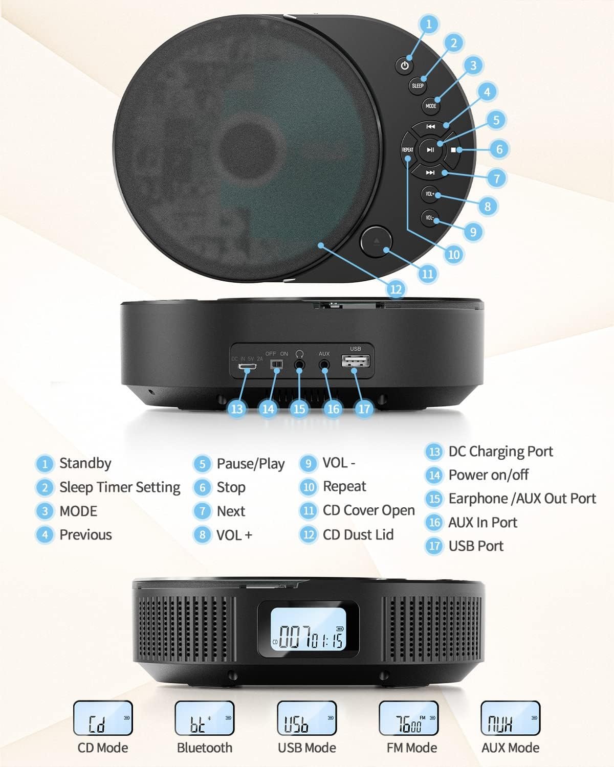 【2 in 1 CD Player & Bluetooth Speaker】Not like other normal cd players, this is not only a portable cd player, but also a portable bluetooth speaker. Built-in newly upgraded dual 15W front-facing stereo speakers, our boombox CD player delivers louder and higher quality sound than others only with 3W or 5W speakers. Also Offer you remote control and 5 different modes to play your music, you can use it in CD Mode, Bluetooth Mode, FM Mode, USB Mode, and even AUX-in mode whichever you like.