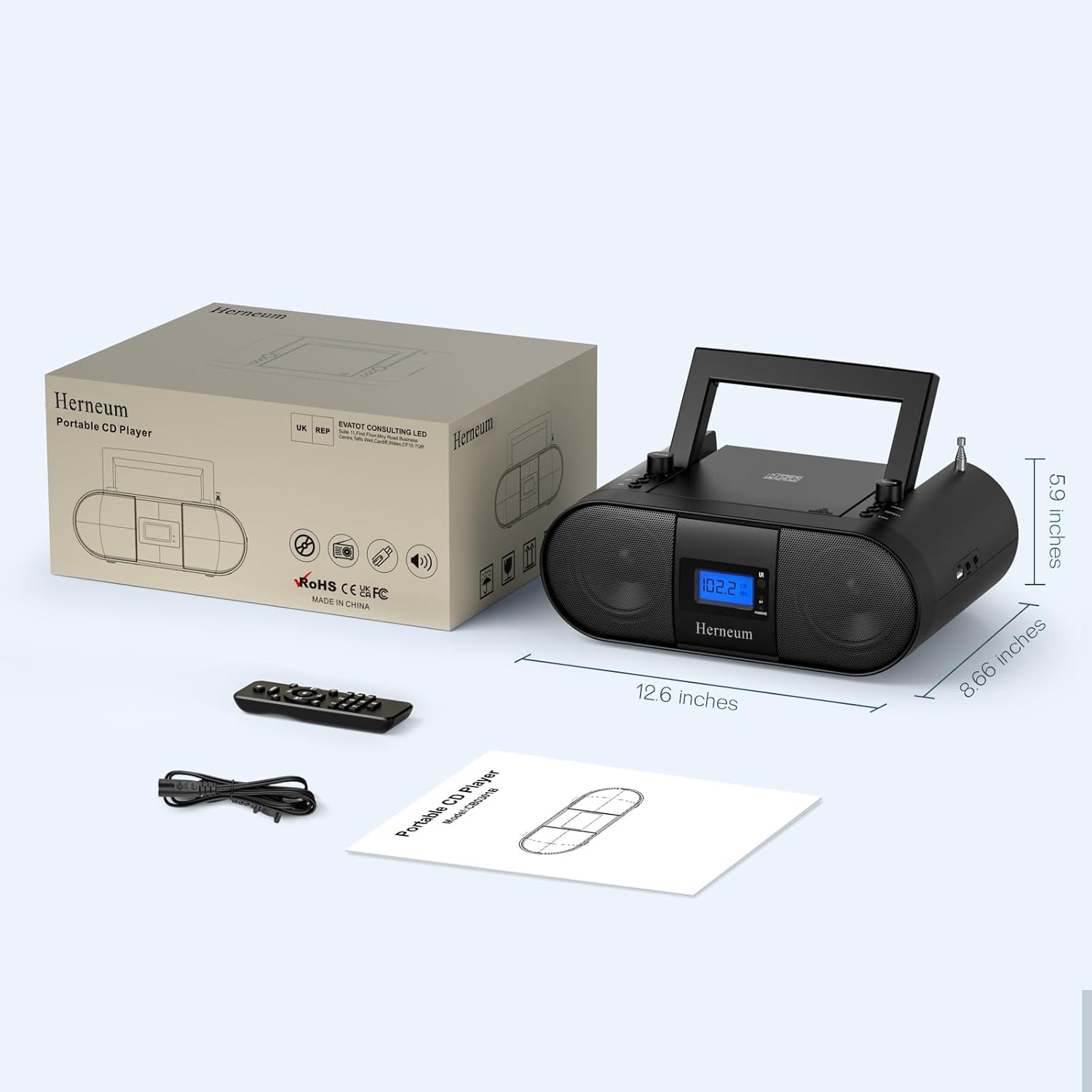 Multi-function CD Player Use this portable home CD player to enjoy your favorite CDs or personally recorded CD-R and CD-RW/MP3 CD compact discs. While playing a track, support one track, all tracks, or random/shuffle mode. Bluetooth Wireless Audio Compatible with Bluetooth-enabled devices (BT 5.1), you can connect your phone and stream your favorite music from Spotify or iTunes, anywhere you are, connect and play while watching some movies and shows. Handle design The portable design, the classic black, and the sturdy scratch-resistant case make the Boombox become the perfect choice of Bluetooth speaker, the built-in handle will be easy to move to wherever you want to! Enjoyable Listening Experience Powerful sound effects enough to have this speaker fill a large living room/courtyard, this versatile boombox is the best audio companion when you go to a home party when you are camping on the beach!