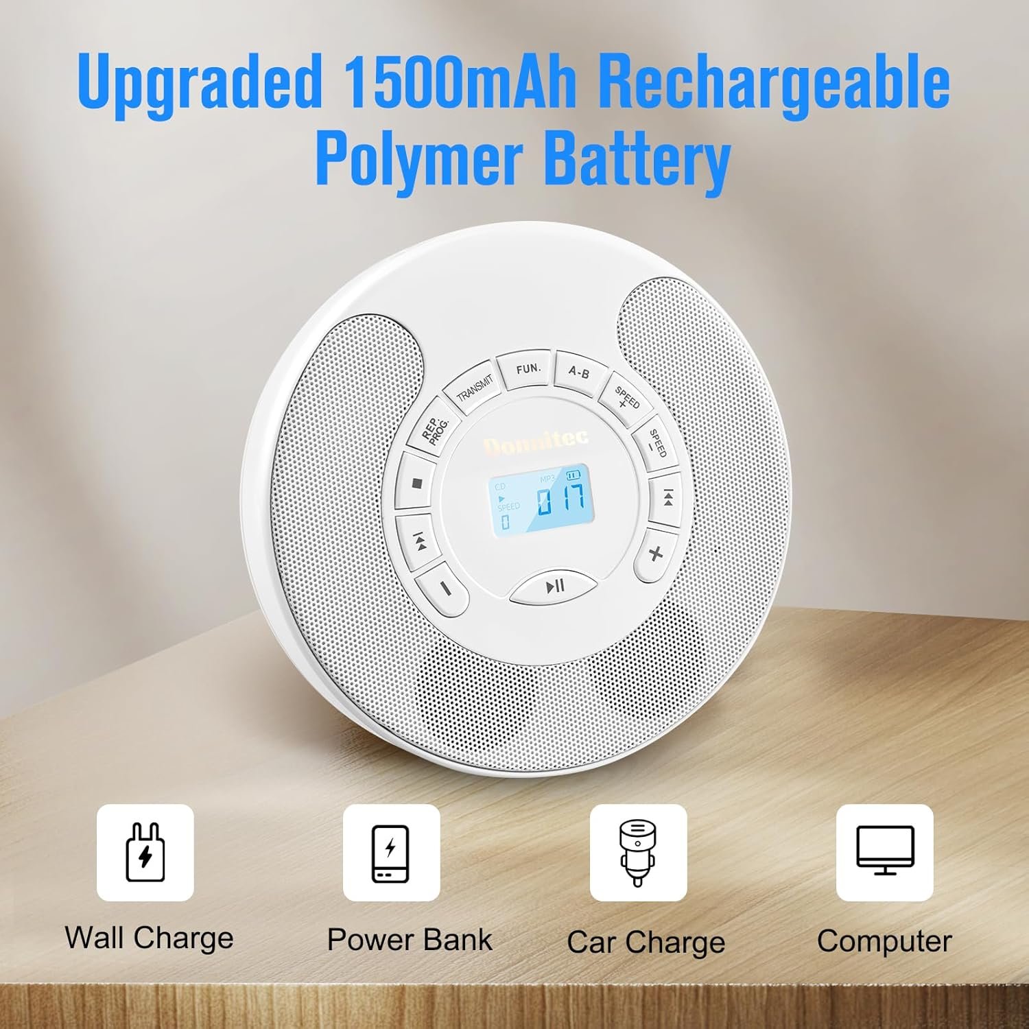 [Rechargeable CD Player] With a built-in 1500mAh battery, The portable CD player Takes 4 hours to fully charge, about 5 hours for CD playback, 4 hours for USB playback, and 7 hours for playback with headphones.