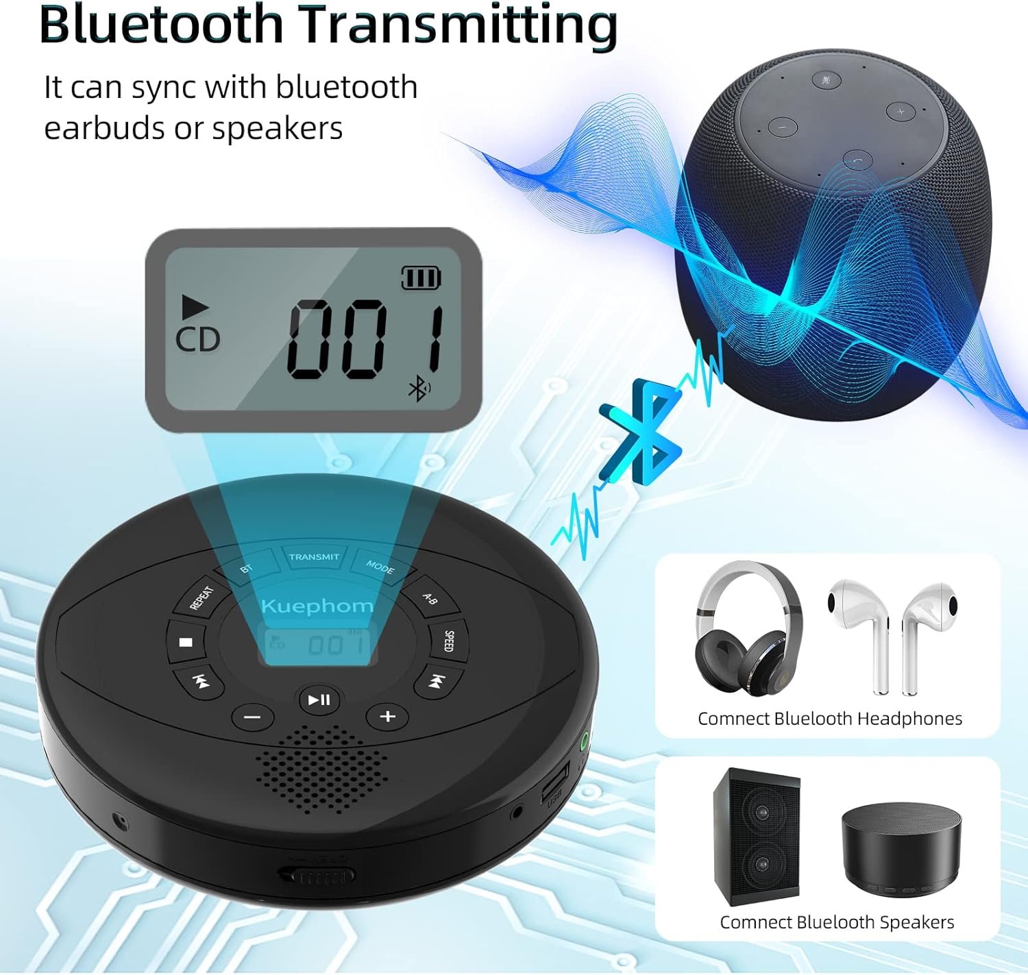 【Portable CD Player with Bluetooth】Portable CD player supports two-way Bluetooth wireless connection, can be used as a signal transmitter to connect with Bluetooth headphones and speakers, or as a receiving amplifier to connect wirelessly with smartphones, laptops, iPads, AirPods, and can be connected to cars via 3.5mm Aux cable.