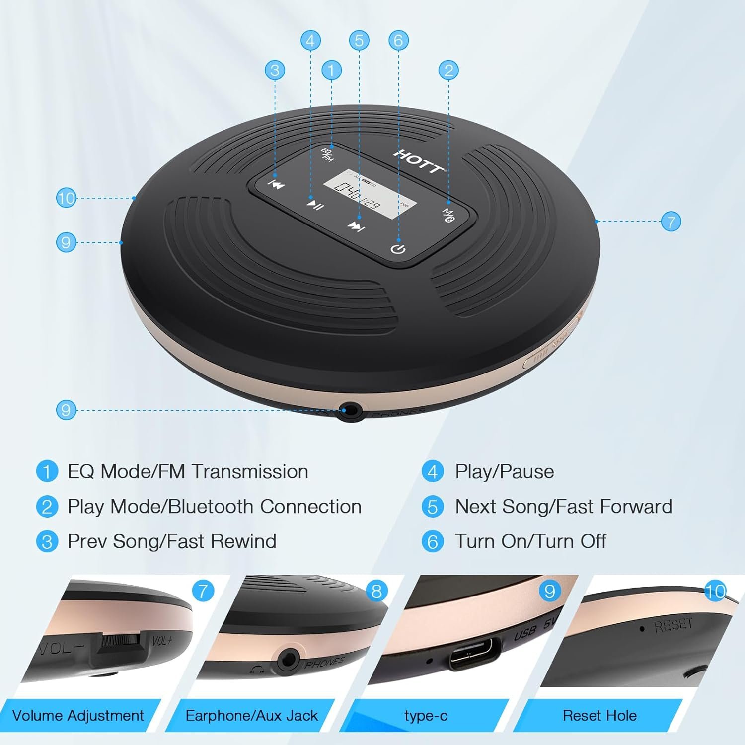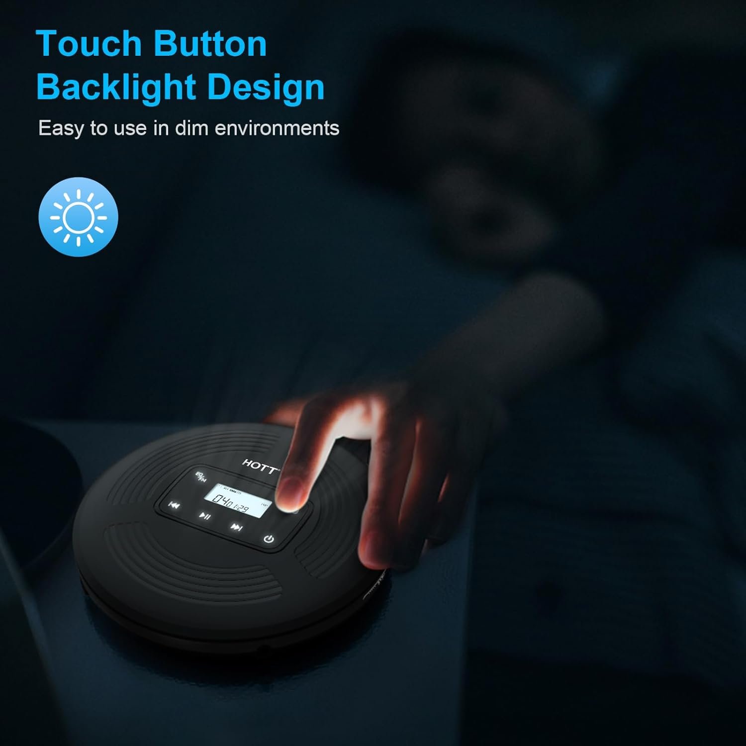 【Rechargeable CD Player】Built-in 1800mAh lithium battery,the HOTT personal CD player can play CDs for more than 10 hours after 3-4 hours of full charge. Using included USB cable for charging, Type-C port,portable and convenient.It’s prefect for home and traveling. Touch technology and backlight design make the disc player different.