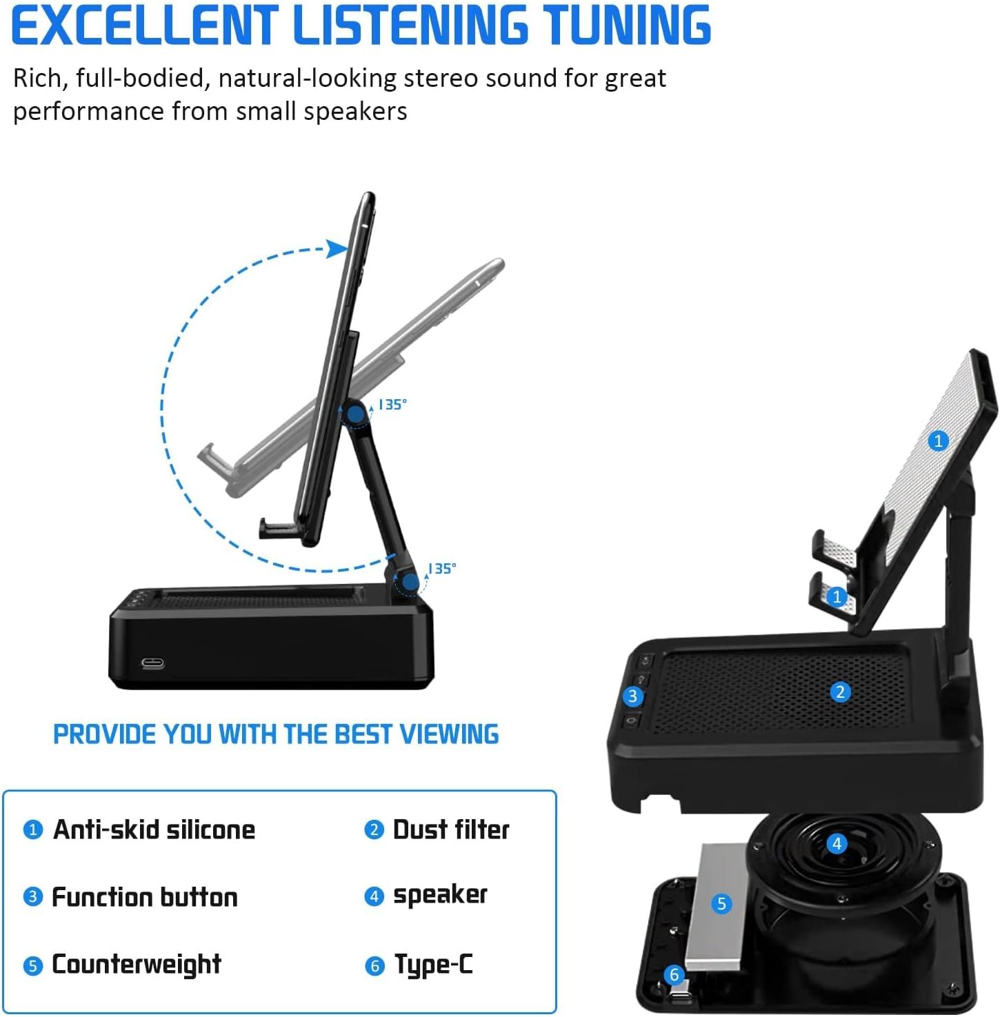 Anti-Skid Silicone Phone holder – The speaker stand pad and the bottom of this cell phone stand are fully covered by anti-skid silicone, which can provide maximum protection for your device from any scratches and slide.