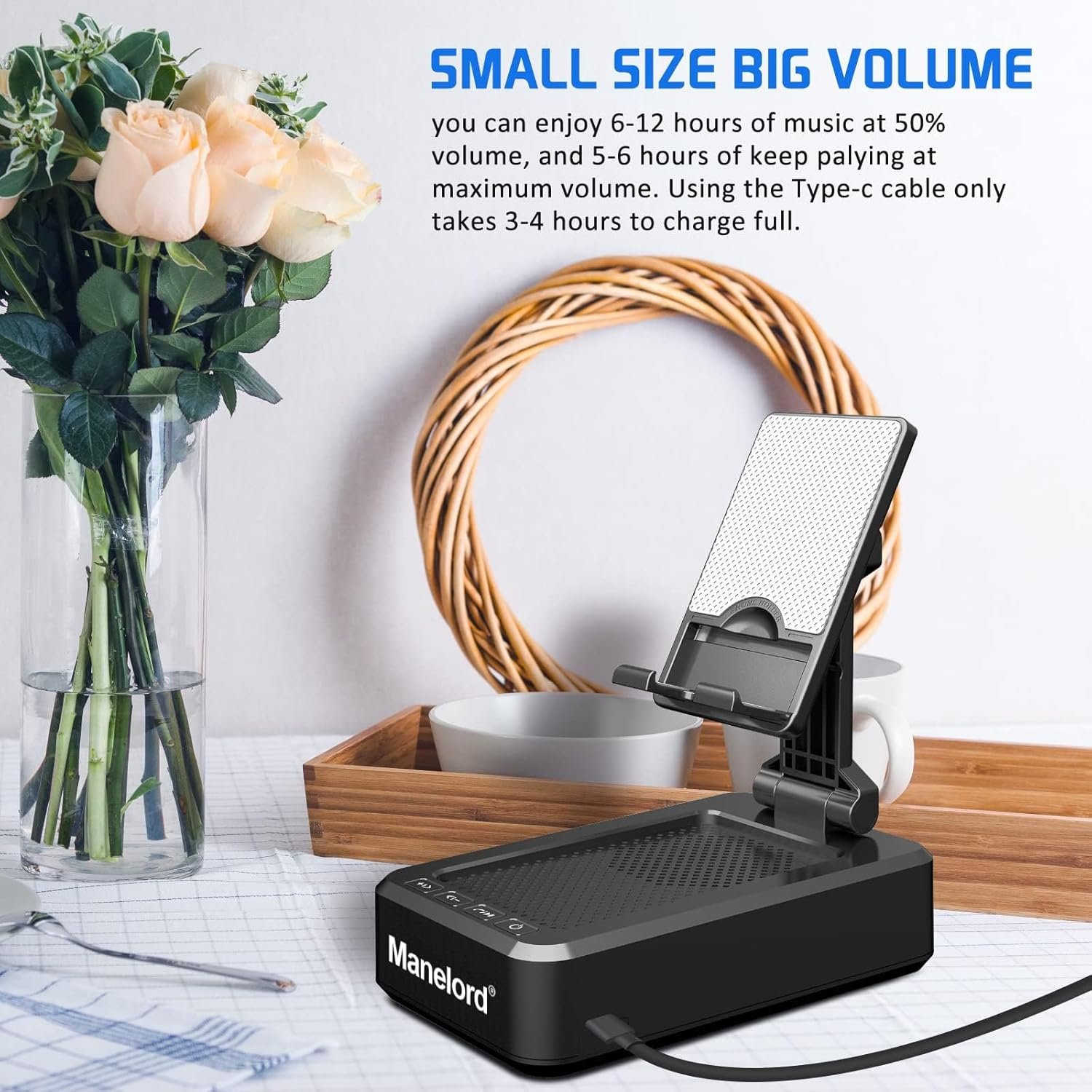 Manelord Bluetooth Speaker – With phone stand for most 4″-13″ Smart cell phones, Tablets and e-readers, Compatible with Phone 12 Pro/11/X/XR/Max, Switch, iPad, Samsung Galaxy S10 /S10 /S9 /S9 /S8 /S8 ,Samsung Tab, LG, Sony, Google Nexus, Kindle etc.