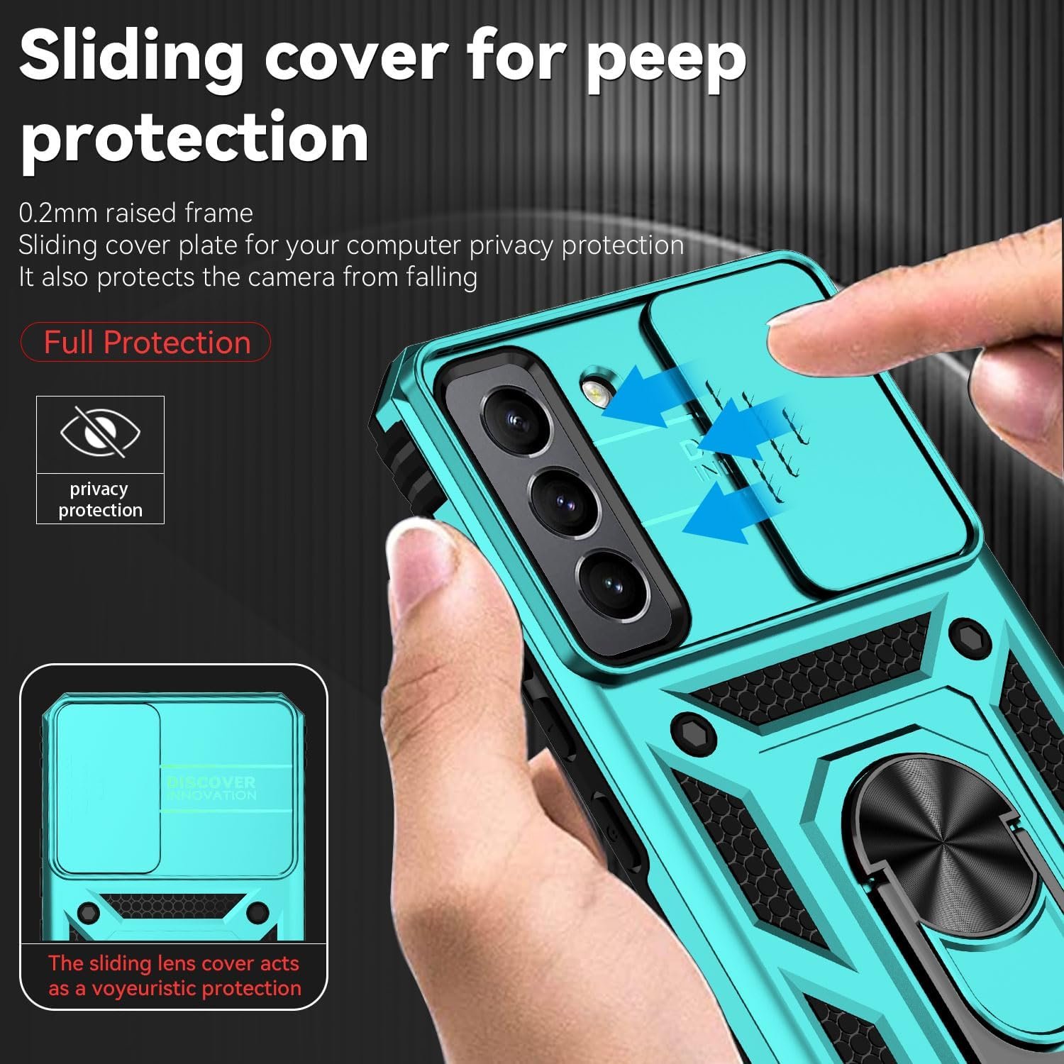 Built-in Camera Lens Cover: The sliding lens cover and 0.2 mm raised bezel protect your phone camera from scratches,collision,wear and impact. It can slide smoothly left and right,perfect to hide the camera.Besides,the sliding cover is slightly locked on both sides and can not be slid at will,which will not affect the normal use of the phone lens.