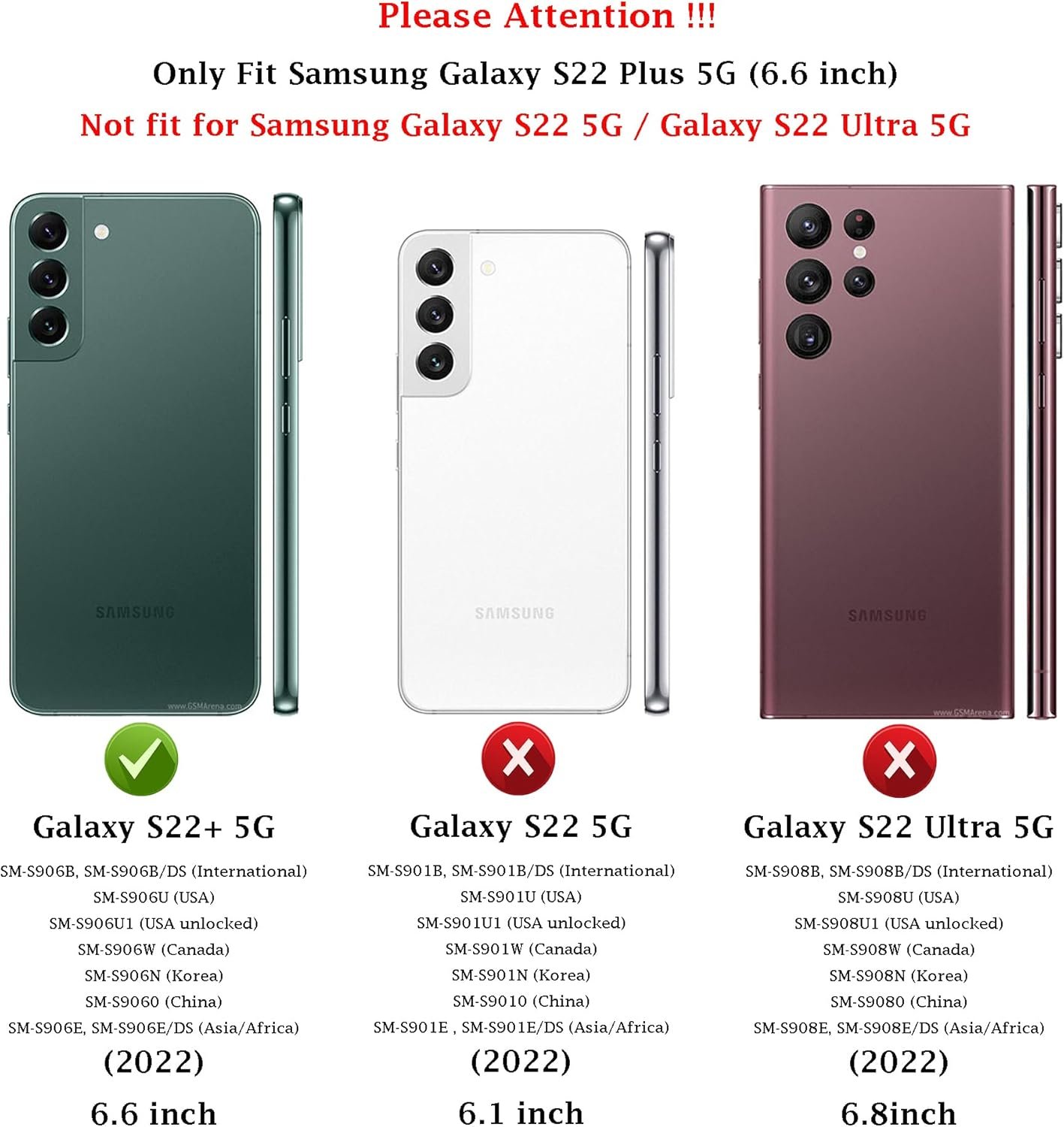 PLEASE NOTE!!! There are four versions of Samsung Galaxy S22 Series phone, this case is only fit for Samsung Galaxy S22 Plus 5G (6.6 inch), (Models: SM-S906B, SM-S906B/DS, SM-S906U (USA), SM-S906U1, SM-S906W, SM-S906N, SM-S9060, SM-S906E, SM-S906E/DS), Released by Verizon, AT&T, T-Mobile, Boost, U.S. Cellular, Xfinity Mobile, Consumer Cellular.