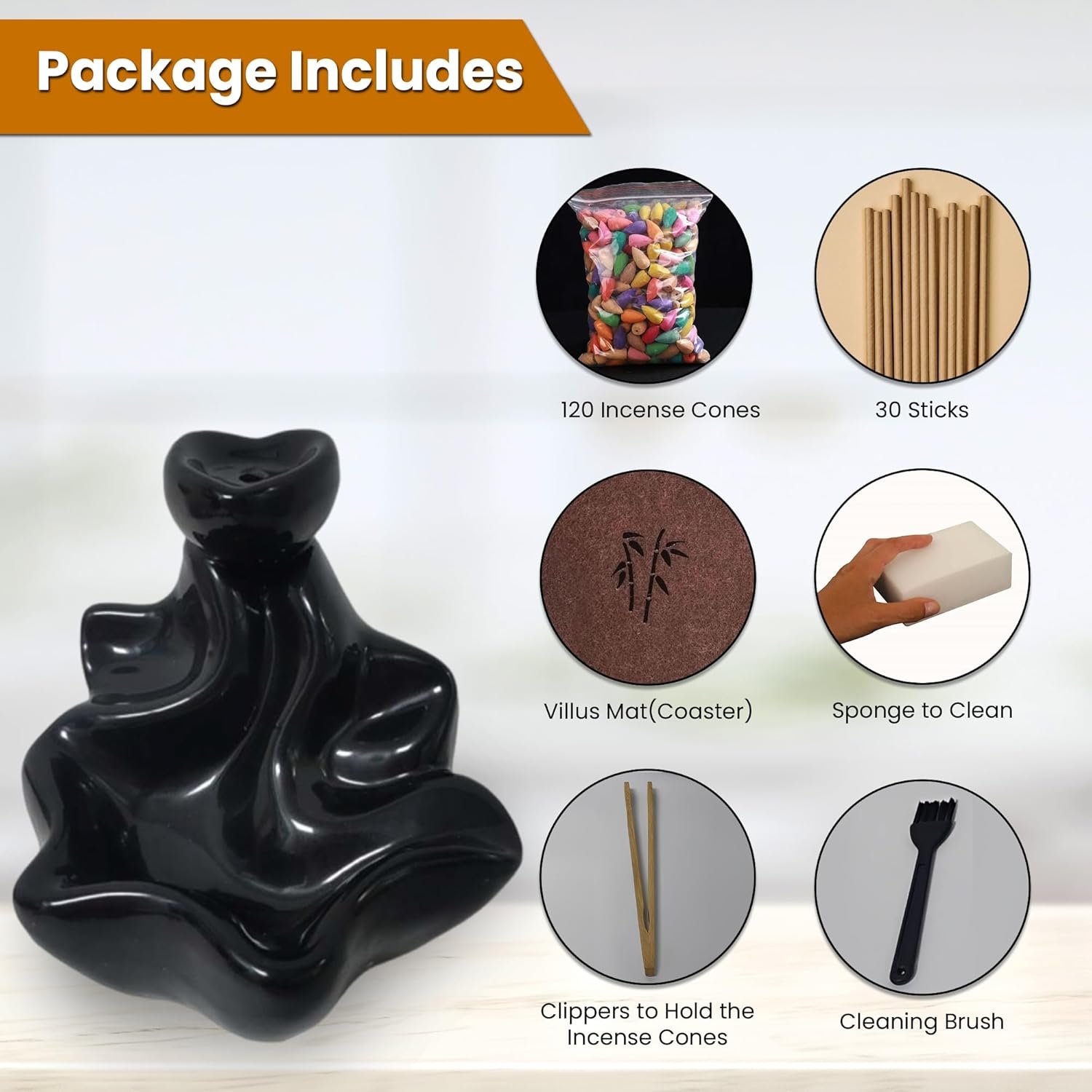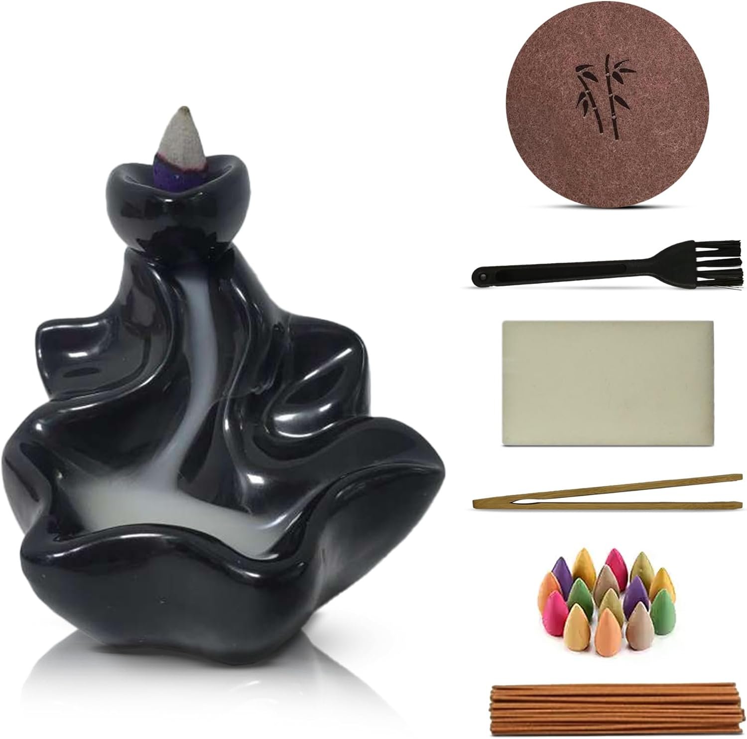 🌟COMPLETE SET: We believe in delivering value. That’s why our kit includes not only the burner and incense but also a tweezer for safe cone handling, a villus mat to protect your surfaces, a sponge for easy cleaning, and a cleaning brush for maintaining the burner’s pristine appearance.