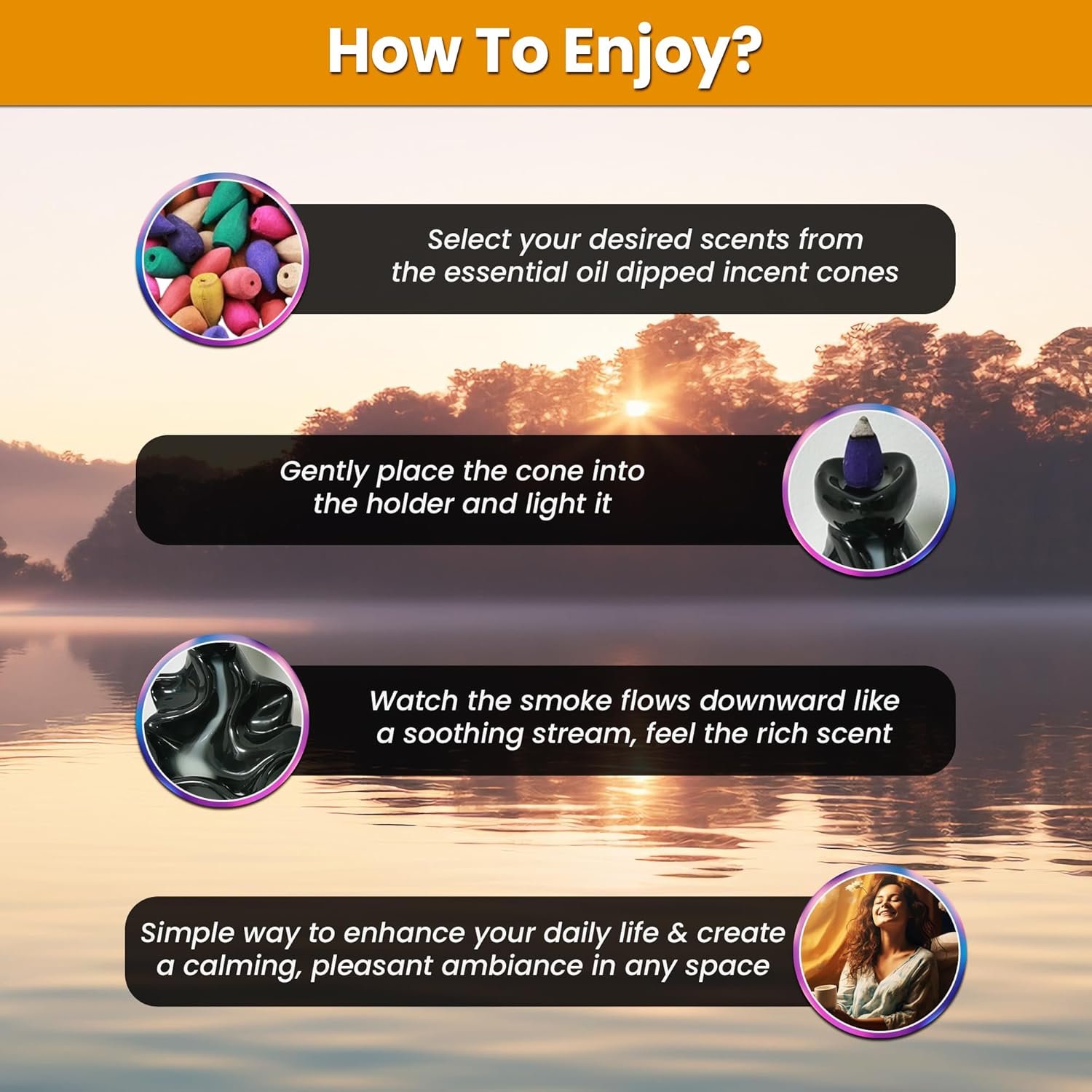 ✔MESMERIZING BACKFLOW EFFECT: Watch as the fragrant smoke cascades in mesmerizing patterns, creating a tranquil and captivating ambiance.