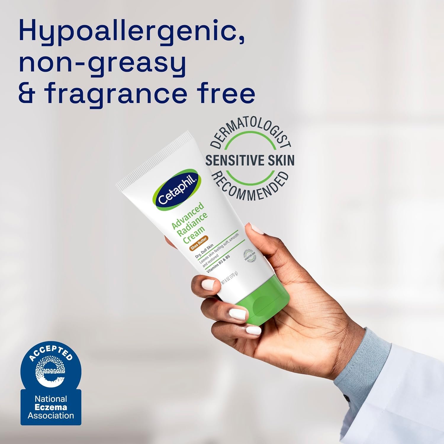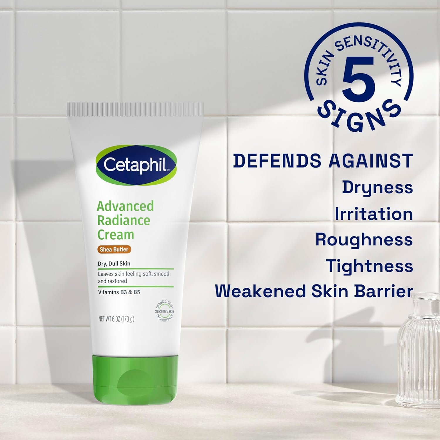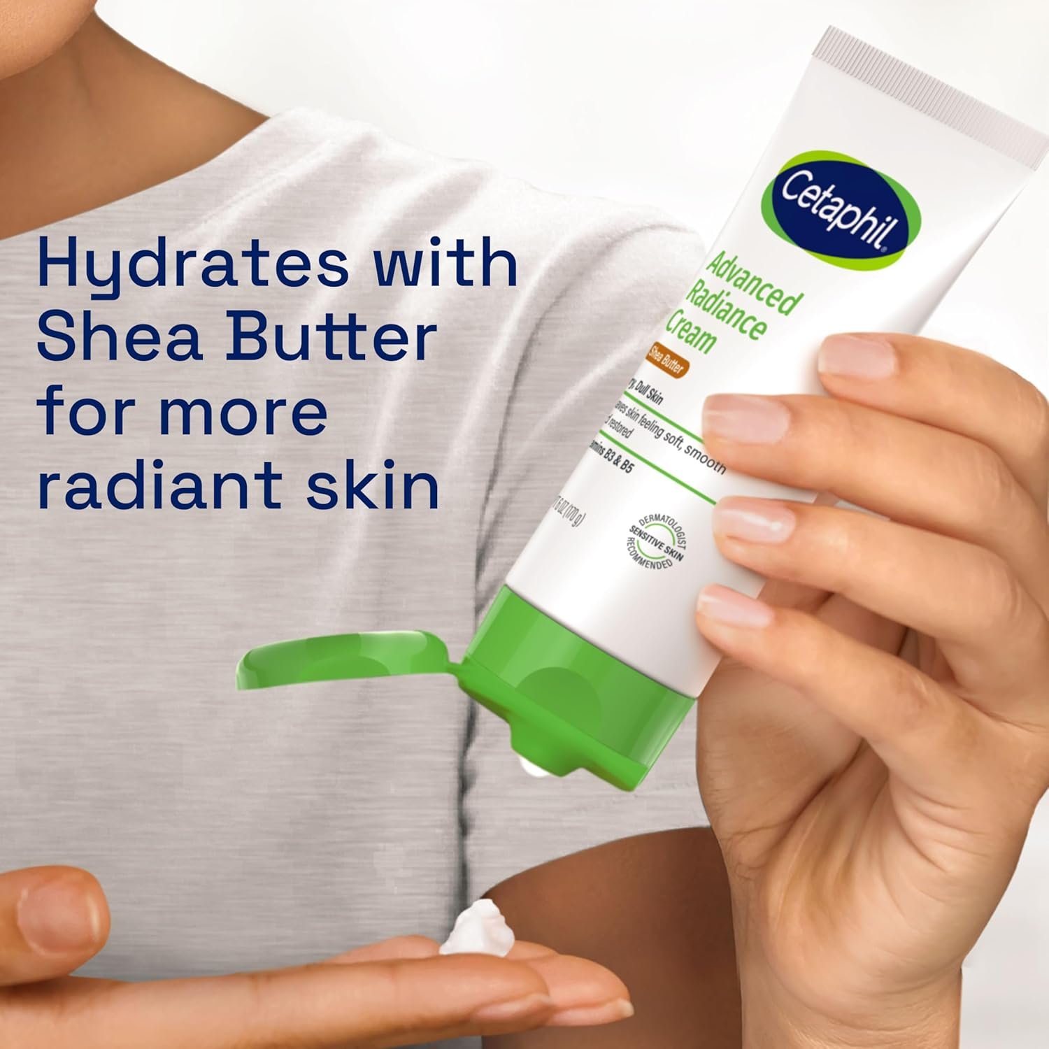 CETAPHIL Advanced Radiance Cream is formulated with shea butter to nourish skin and leave it feeling soft, smooth and restored. This rich face & body cream is clinically proven to lock in moisture and replenish dry, dull skin for 48 hours. Long lasting hydration visibly enhances skin tone, texture and luminosity. Enriched with safflower seed oil to smooth and soften dry skin, and vitamin E to support moisture barrier function. 94% reported softer and smoother skin in 1 week. This advanced formula helps to defend against 5 signs of skin sensitivity. This nourishing cream is hypoallergenic, fragrance free, paraben free and non-comedogenic, suitable for even the most sensitive skin and dermatologist developed for all skin tones and types. For complete care of your dry, dull skin, use together with CETAPHIL Advanced Radiance Lotion for optimal skin hydration.