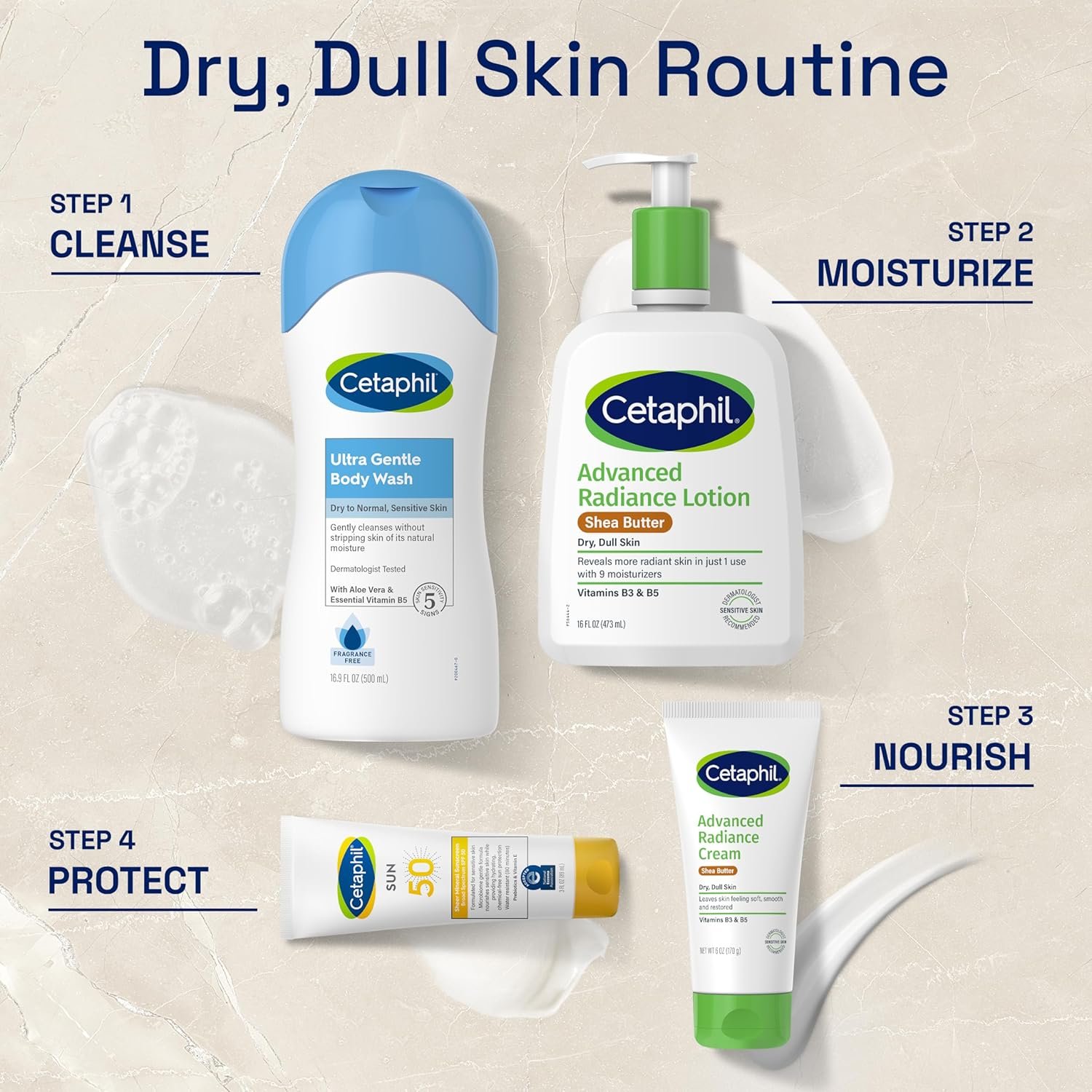 CETAPHIL ADVANCED RADIANCE FACE & BODY CREAM: Enriched with a high concentration of shea butter to deeply moisturize and nourish skin while helping to prevent visibly dry skin from coming back