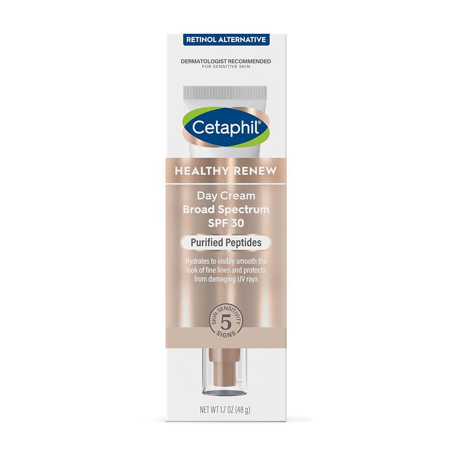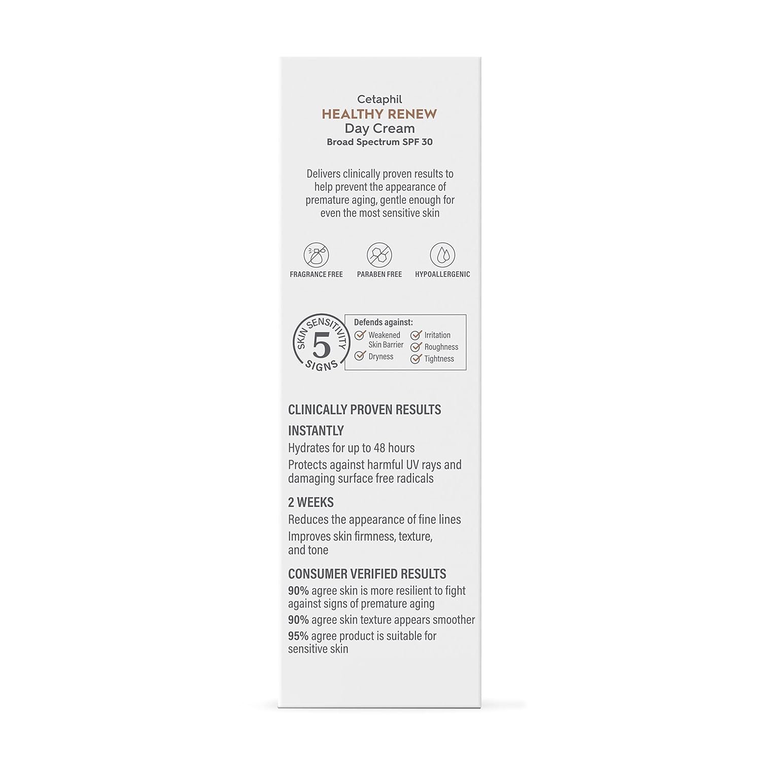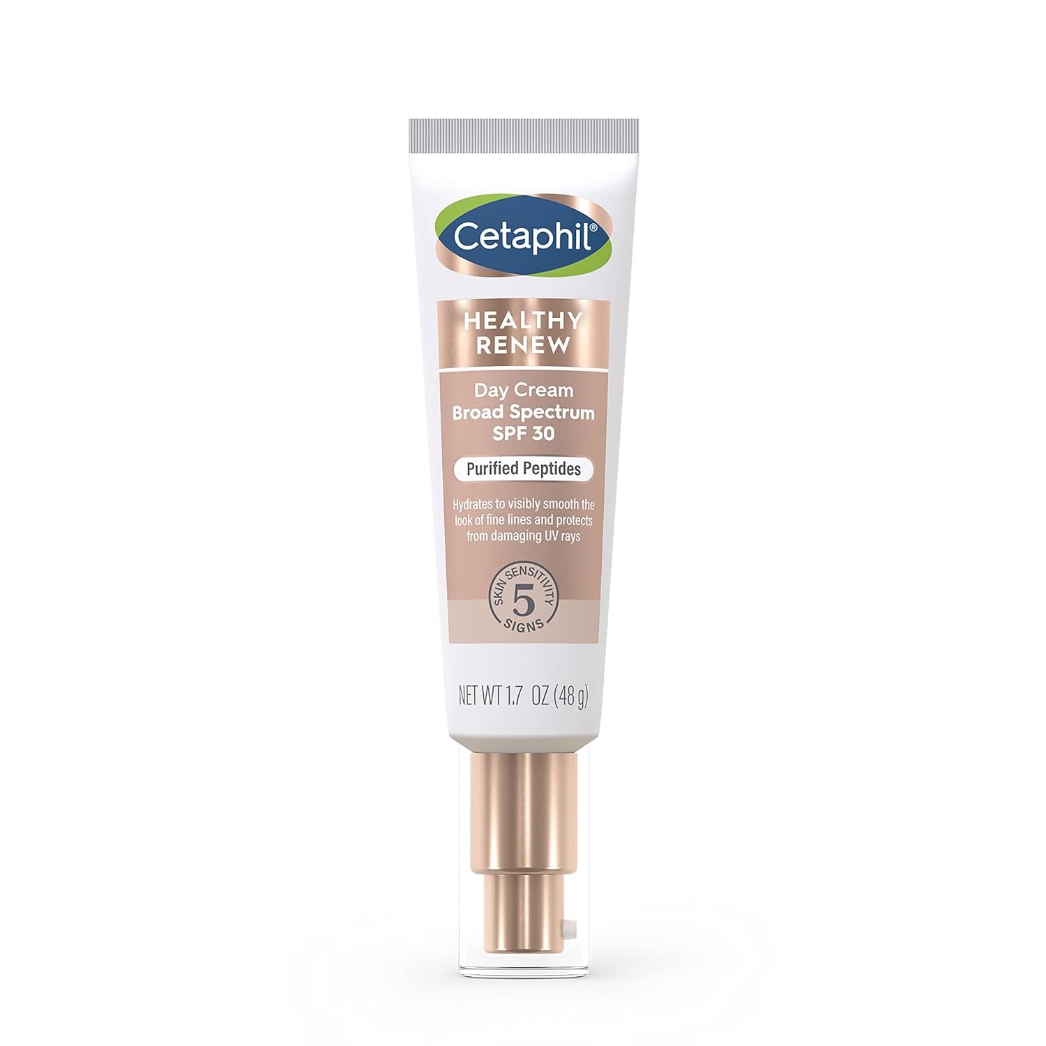 Protect your sensitive skin every day with CETAPHIL HEALTHY RENEW Day Cream SPF 30, developed with and recommended by dermatologists. This daily use face moisturizer with broad-spectrum SPF 30 hydrates and visibly smooths the look of fine lines while protecting against damaging UV rays. Powered by retinol alternative, purified peptides, this serum is clinically proven to help prevent and reduce the visible signs of aging while being gentle on even the most sensitive skin. This anti-aging face cream also contains vitamins B3 (niacinamide) and B5 (panthenol) to help hydrate, soothe and repair the skin barrier, plus botanical extracts (rice lees and edelweiss) to target visible dullness and uneven skin tone. This non-greasy formula absorbs quickly and provides long lasting hydration for up to 48 hours as well as daily protection from harmful UVA/UVB rays and surface free radicals. It defends against 5 signs of skin sensitivity – dryness, irritation, roughness, tightness and a weakened skin barrier.