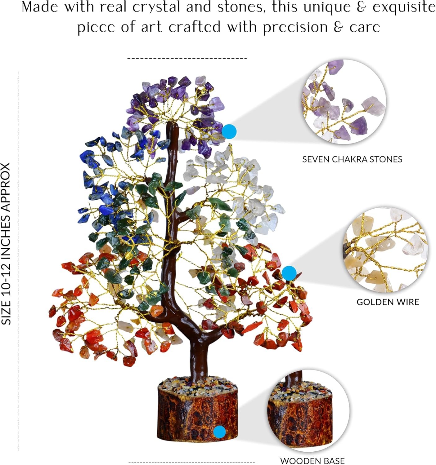 Our 10-12 inches seven chakra tree, Gem tree stones of the crystal tree of life are coupled with a golden wire including a natural wooden base.