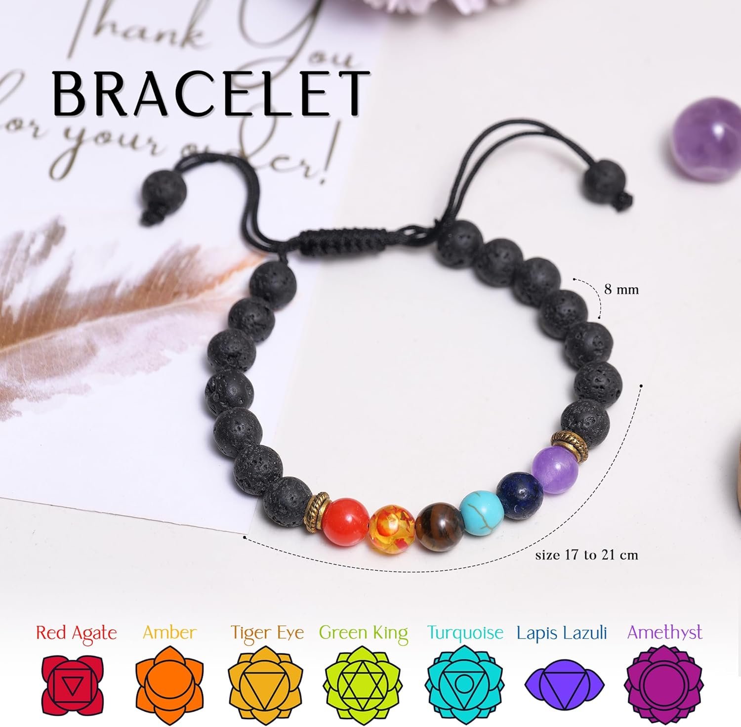 red jasper, clear quartz, yellow aventurine, green aventurine, carnelian, lapis lazuli, and amethyst.