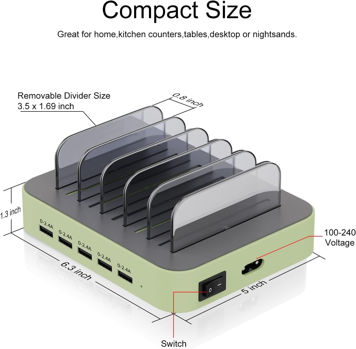 【Multi Protection】Every port of the multi charger station will offer exactly the charging current required to match your devices needs, keeping your phones safe. The phone charging station features a safety switch giving you a quick visual indication that it is powered on. Removable dividers can hold your large tablets even with thick case.