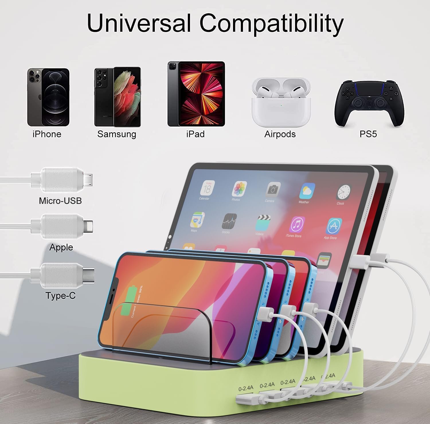 【Universal Compatibility】The charging station comes with 7 cables that are designed for your lphone 16 Series,15,15Pro, 14, 14Pro, lphone 13, 13Pro, 12, 11, 11Pro, XS, XS Max, XR, X, SE, 8, 8 Plus, 7, 7 Plus, Ipads, Samsung Galaxy S10, S10Plus, S9, S8, tablets, and other electronics. USB-A charging station with 3 ios cables, 2 micro-USB cables and 2 USB-C cables.