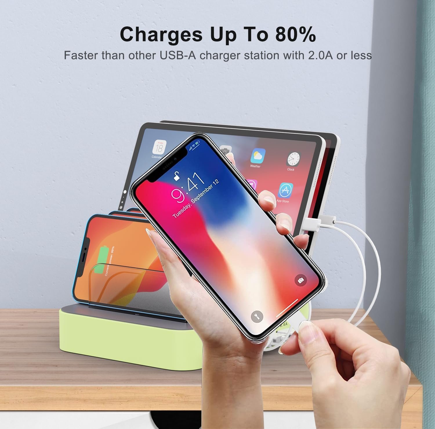 【Fast and Smart】This charging station for multiple devices will charge your smartphones, and tablets up to 80% than other USB-A charger stations with 2.0A or less. Our multi port charging stations will automatically detect your devices and adjust voltage for minimal charging time.