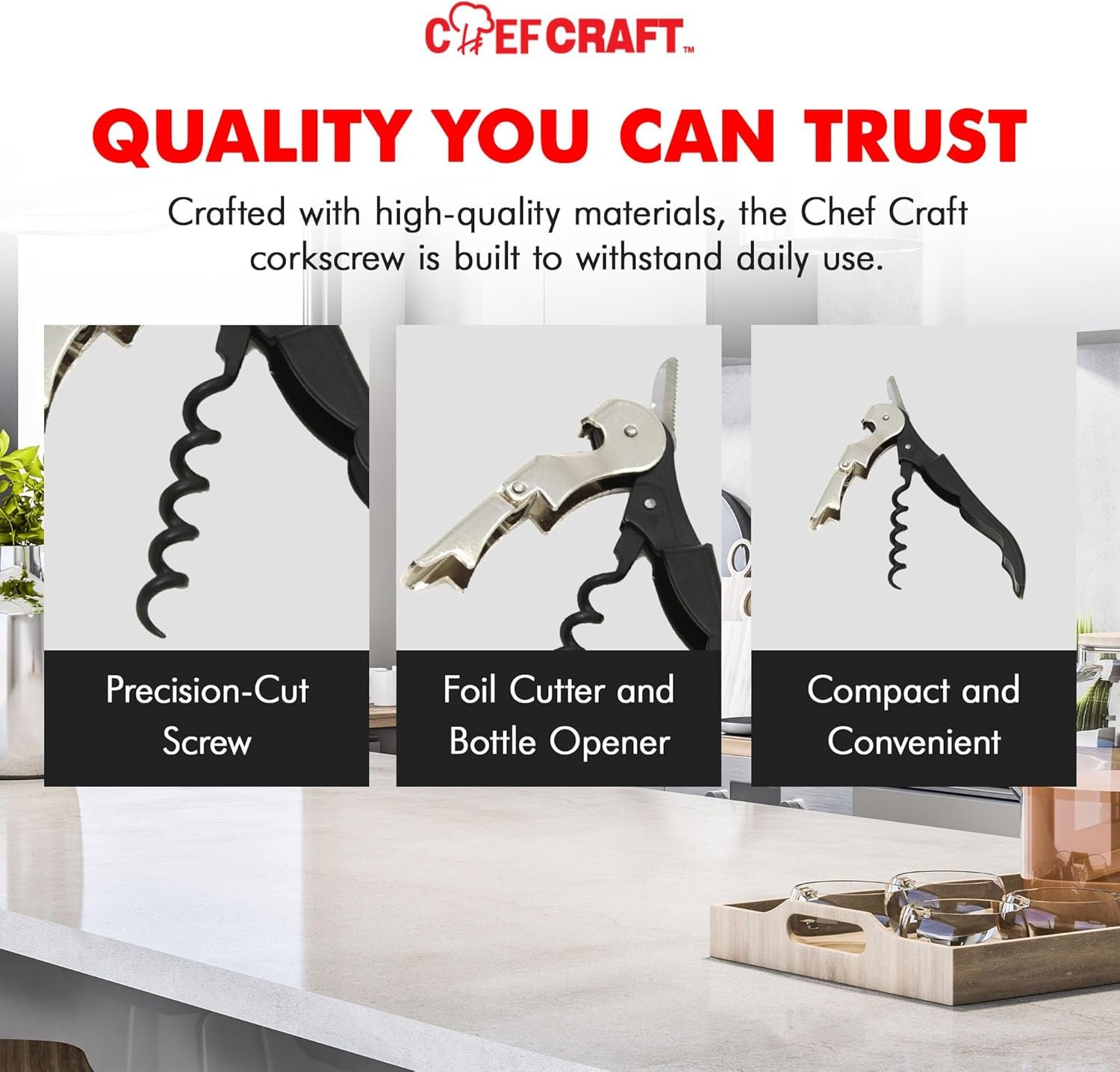 Corkscrew includes built in foil cutter and bottle opener
