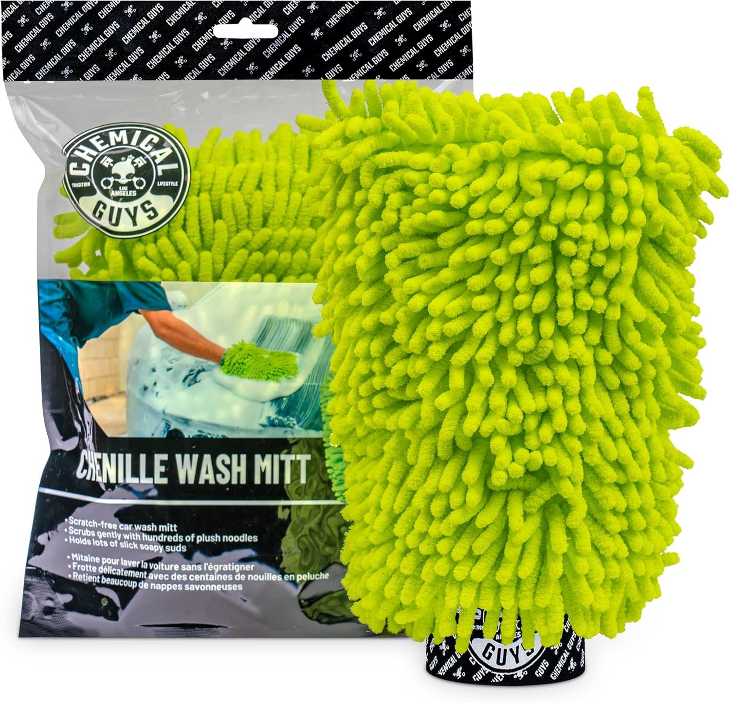 The Chenille Wash Mitt is made of extra plush microfiber that holds tons of clean water and soap to drench any car in thick foaming suds for the ultimate scratch and swirl free washing experience. How to Use it 1. Use two buckets: fill one bucket with 5 gallons of water and 1 – 3 oz of Chemical Guys car wash soap and the other with plain water. 2.Rinse your car, then wash in straight lines with the soapy mitt. 3.After cleaning a panel or two, dip the dirty mitt in the bucket of plain water to loosen the embedded dirt, then wring it out on the ground. 4.Return to the soap bucket and continue to wash the whole car. 5.Rinse away all soap and dirt from the car, then dry with premium microfiber towels.