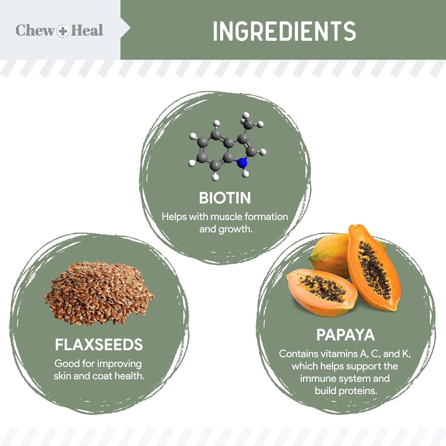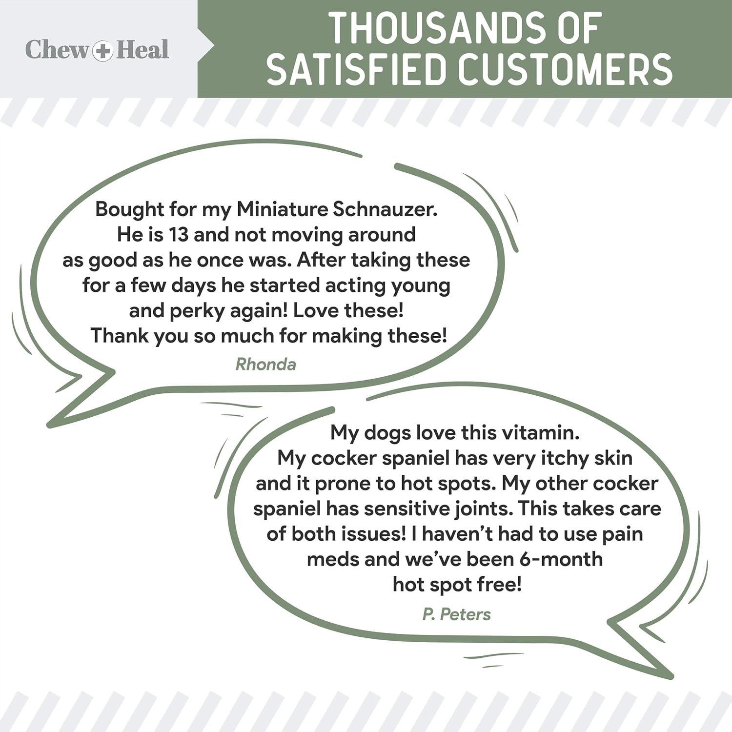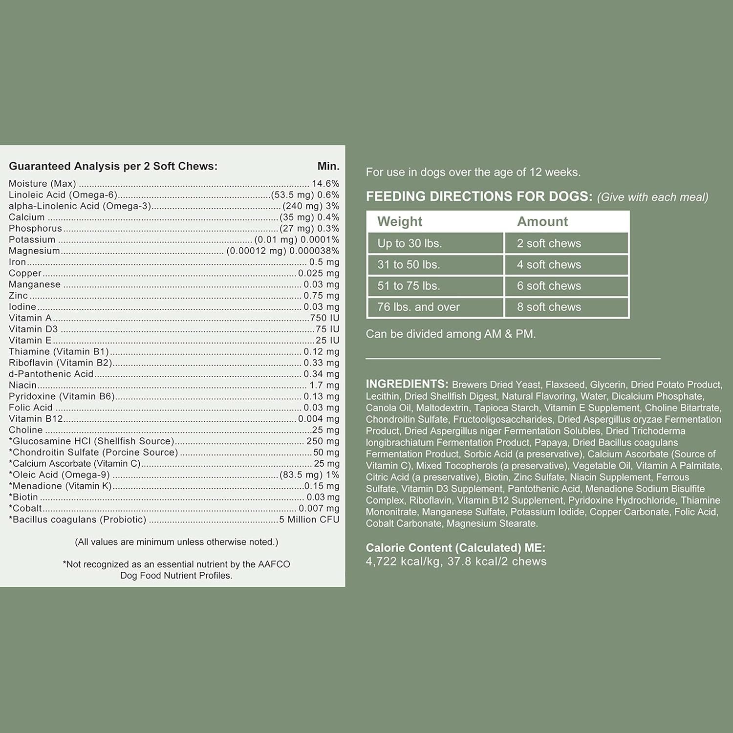 MADE IN AMERICA: Along with those ingredients come all the vital minerals your dog needs every day, including calcium, vitamin A, B, C, D, & E, magnesium, iron, folic acid, biotin and more. Check the bottle for dosage recommendations, 120 chews is up to a 60 day supply! The treats are delicious!