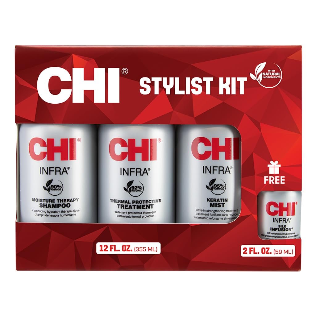 KIT FOR STRENGTHENING HAIR: CHI Infra Shampoo corrects the moisture balance of the hair, CHI Infra Treatment improves strength & elasticity, CHI Keratin Mist protects the hair from heat & CHI Silk Infusion adds moisture & shine.