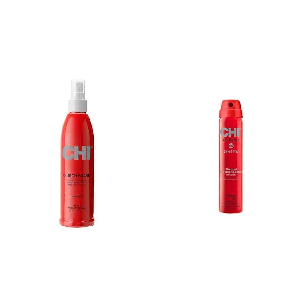 This two-piece hair care bundle from CHI includes thermal protection and styling products to keep your hair looking great. The 8 oz CHI 44 Iron Guard Thermal Protection Spray shields hair from heat damage during styling while the CHI 44 Iron Guard Style & Stay Firm Hold Protecting Spray provides strong hold for smooth blowouts and curly styles. The Iron Guard Thermal Protection Spray contains a lightweight formula that seals the hair cuticle to prevent breakage and future damage from styling tools up to 450°F. Its easy application works from the inside out to build resilience with strengthening proteins and ceramic compounds. Complementing the thermal protection, the Style & Stay Firm Hold Protecting Spray offers heat defense up to 450°F. As you create voluminous blowouts or touchable curls, the working formula maintains shape and vibrancy. This unique CHI system dramatically reduces styling damage for healthier hair.