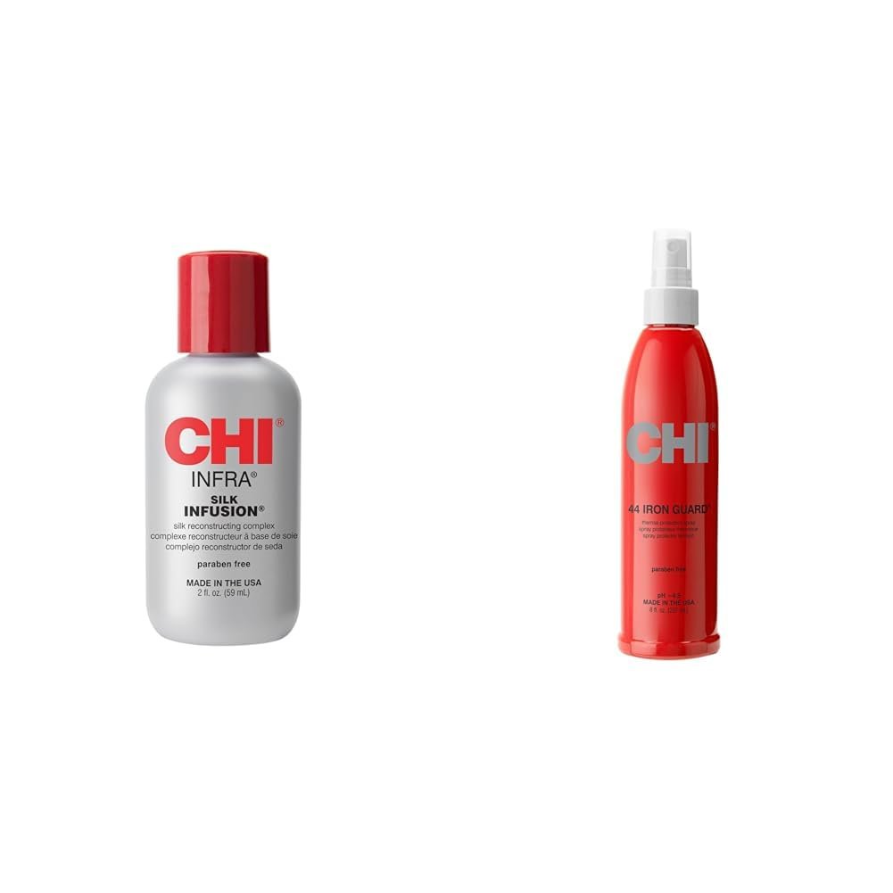 This hair care bundle includes two complementary products to help protect and nourish your hair. The CHI Silk Infusion is a leave-in treatment with pure silk, wheat and soy proteins to deeply condition hair and protect against heat styling. It leaves hair incredibly soft and manageable without buildup. The second product is CHI’s 44 Iron Guard Thermal Protection Spray which shields hair from heat damage during styling. Its lightweight formula seals the cuticle to prevent breakage and future damage. Together these two treatments offer complete protection. The Silk Infusion penetrates to strengthen strands with natural proteins and vitamins. While the Iron Guard Spray coats hair to defend from external heat. Both contain thermal protection and suit all hair types. The Silk Infusion can be applied to damp or dry hair before heat styling. And the Iron Guard Spray is formulated to brush smoothly onto hair before hot tools are used. This bundle is ideal for anyone who frequently heat styles their hair. It will lead to softer, shinier, and undamaged hair even with repeated exposure to hot styling tools.