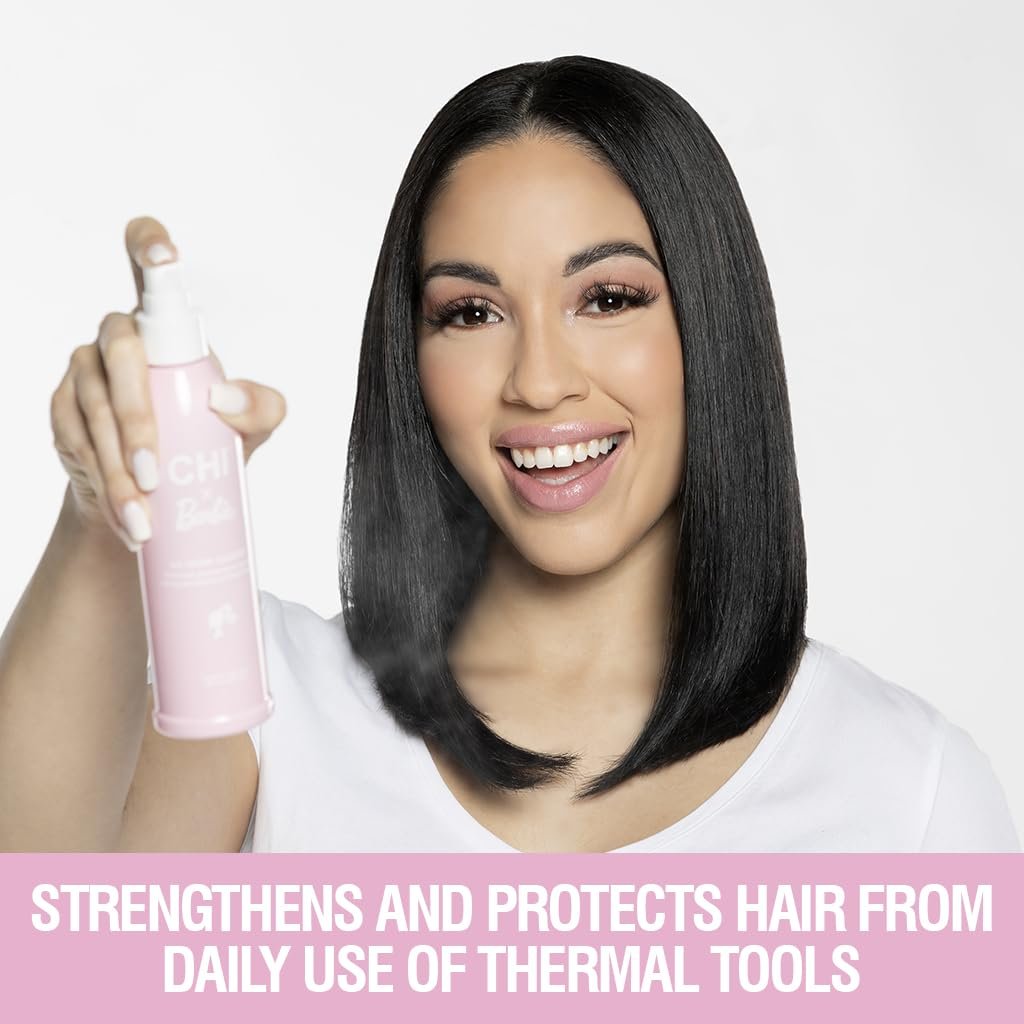 How to Use: Begin with CHI x Barbie Moisture Therapy Shampoo, lathering and rinsing thoroughly. Follow with CHI x Barbie Moisture Therapy Conditioner, applying evenly and leaving on for optimal hydration. Before styling, spray CHI x Barbie 44 Iron Guard on dry or damp hair for heat protection.