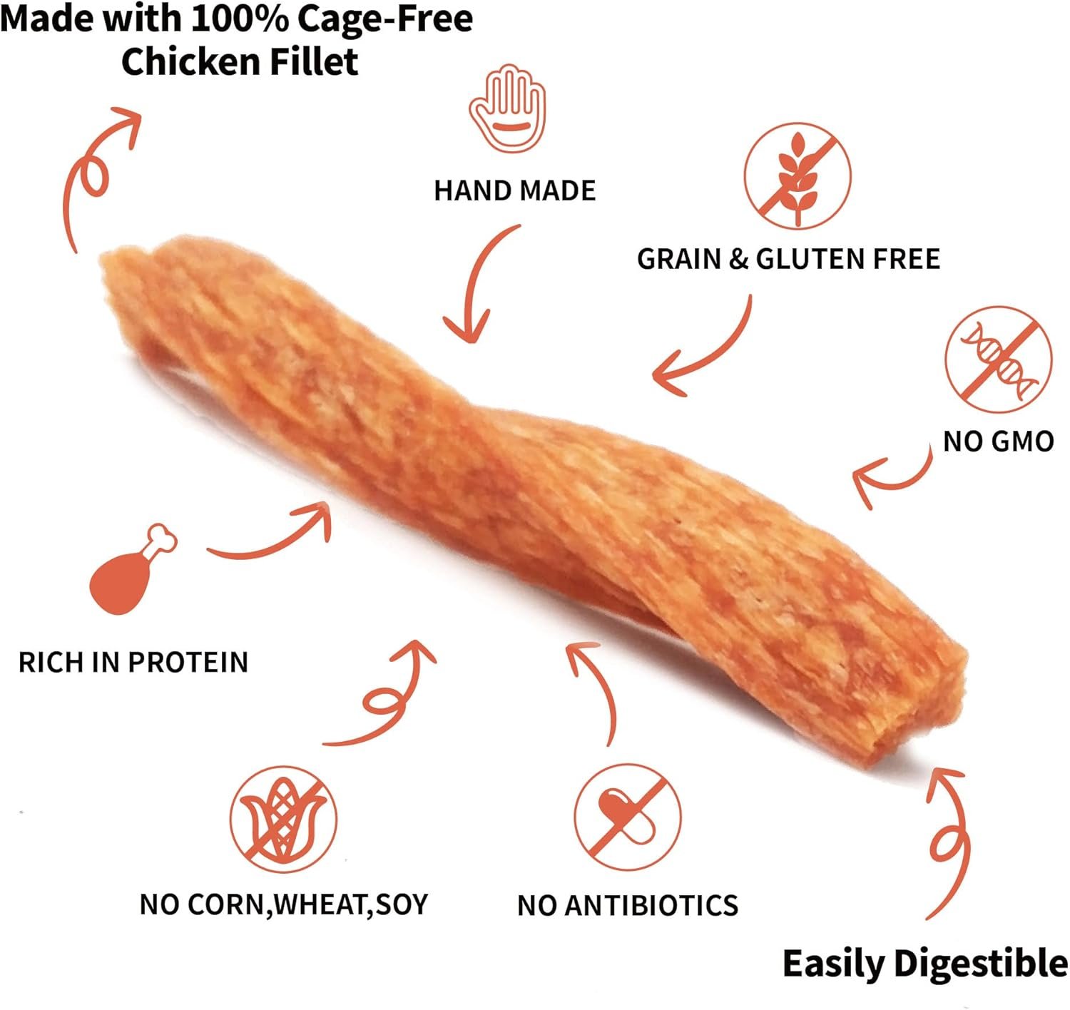 Healthy & Safe: Puffed Chicken Twists are rawhide free, wheat free, no fillers, no artificial colors. High in Protein, Low in Fat. It has the benefits of a rawhide chew – without the rawhide.