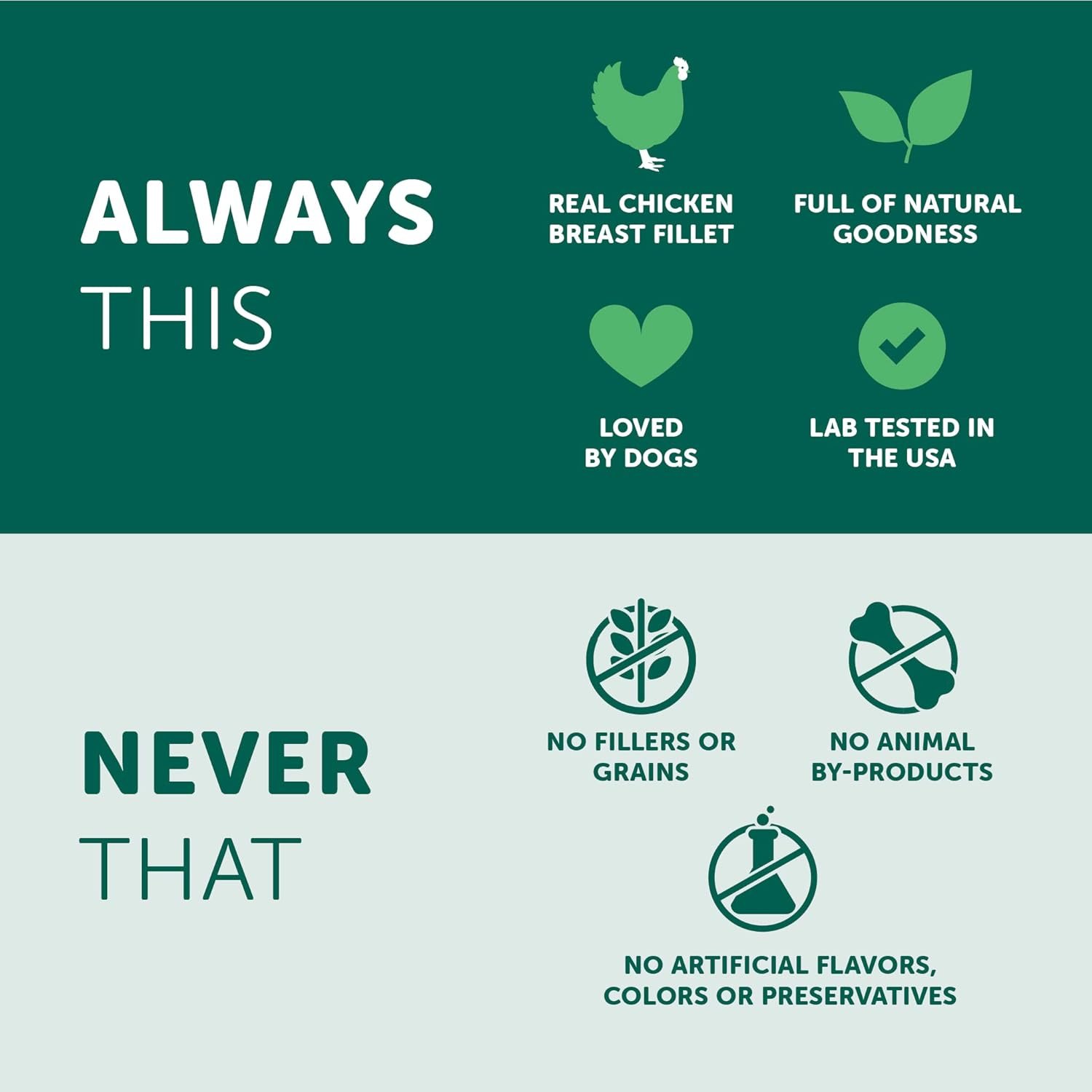 WHOLESOME INGREDIENTS – With chicken breast as the first ingredient, these treats are also made without the use of artificial flavors, colors, preservatives, or fillers.