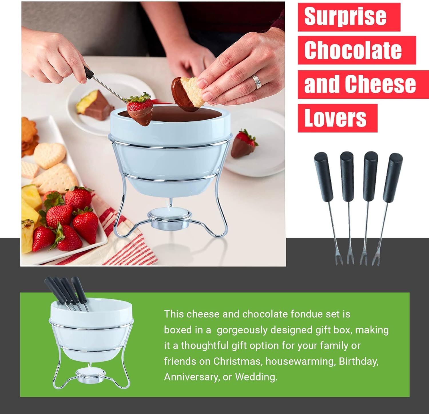 A NOVELTY GIFT FOR CHOCOLATE AND CHEESE LOVERS: This lightweight and multipurpose chocolate warmer is perfect as a soup warmer, dipping sauce bowls, serving hot chocolate, melting butter, and more. This sophisticated fondue set makes a thoughtful gift for your special someone, especially if they can’t seem to get enough cheese or chocolate!